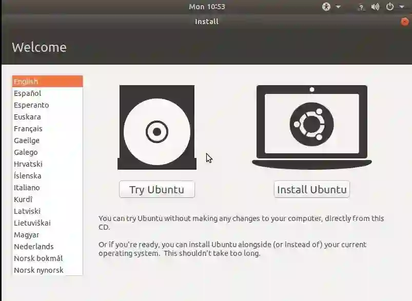 在成功启动后,您将看到如上图显示,要求您尝试 Ubuntu 或安装 Ubuntu,选择安装 Ubuntu。