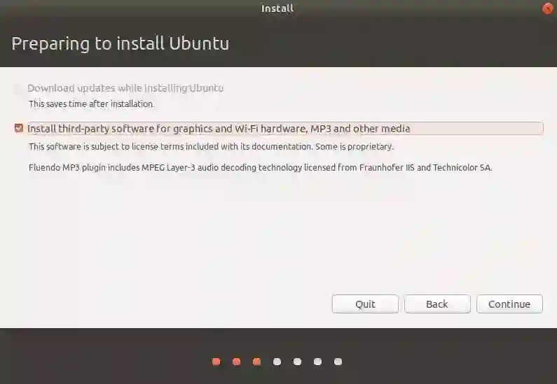 然后检查安装第三方软件的图形和 WiFi 硬件、MP3 和其他媒体。如果你有一个互联网连接,你可以选择在安装 Ubuntu 的时候下载更新,因为它会节省安装时间,并且确保安装的是最新更新。