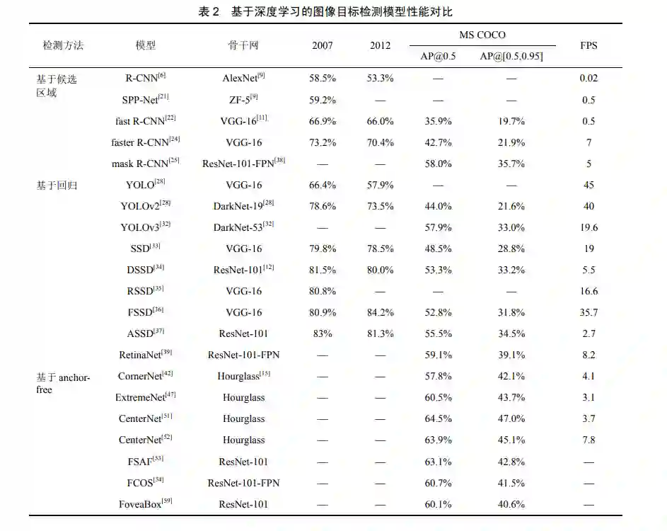 本文对现有经典图像目标检测模型的创新点 及优缺点做出对比,见表 1。无论是候选区域法、 回归法还是 anchor-free 法,提出模型的主要目的 都是为了能够高精度、高速率地识别并检测出目 标。由表 1 可以看出,基于候选区域法模型的提 出开启了用 CNN 提取特征的大门使图像目标检 测进入深度学习时代,回归法则解决了候选区域 法的速度瓶颈问题,实现了端对端的图像目标检 测。而基于 anchor-free 的算法消除了候选区域法 和回归法中候选框的设计,生成高质量的目标框 并在未来形成了一个有前途的方向。对本文中提到的图像目标检测模型在公共数 据集上的检测结果做出对比,见表 2。“—”表示 此数据集没有该模型的测试结果,2007 表示数据 集 VOC 2007,2012 表示数据集 VOC 2012;AP@0.5 表示该模型在 MS COCO 数据集上是取 阈值为 0.5 计算精度的,AP@[0.5,0.95]表示该模 型在 MSCOCO 数据集上是取 10 个阈值(间隔 0.05)计算精度的,即 mAP,表 2 中所有的数据 集精确率检测结果均以百分比为单位。FPS 表示 该模型每秒处理图片的数量。