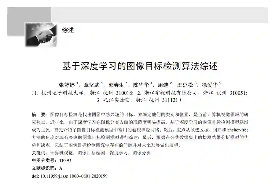 计算机视觉(computer vision)是人工智能 (artificial intelligence,AI)的关键领域之一,是 一门研究如何使机器“看”的科学。图像目标检 测又是计算机视觉的关键任务,主要对图像或视 频中的物体进行识别和定位,是 AI 后续应用的基 础。因此,检测性能的好坏直接影响到后续目标 追踪[1-2]、动作识别[3-4]的性能。传统图像目标检测的滑窗法虽然简单易于理 解,但随目标大小而变化的窗口对图像进行从左 至右、从上至下的全局搜索导致效率低下。为了 在滑动窗口检测器的基础上提高搜索速度, Uijlings 等[5]提出了选择性搜索方法(selective search method),该方法的主要观点是图像中的 目标存在的区域具有相似性和连续性,基于这一 想法采用子区域合并的方式进行候选区域的提取 从而确定目标。Girshick 等[6]提出的基于区域的卷 积神经网络(region-based convolutional neural network,R-CNN)就是采用了选择性搜索方法提 取候选区域,进而越来越多的学者在不断改进确 定目标的方法的基础上提出新的检测模型。