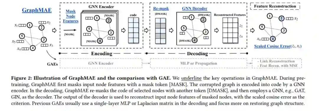 自监督学习(Self-supervised learning, SSL)是近年来的研究热点。特别是,生成式SSL已经在自然语言处理和其他领域取得了成功,例如BERT和GPT的广泛采用。尽管如此,对比学习(严重依赖结构化数据增强和复杂的训练策略)一直是图SSL的主要方法,而在图上生成SSL的进展,特别是图自编码器(GAEs),迄今尚未达到其他领域所承诺的潜力。在本文中,我们识别并研究了对GAEs发展产生负面影响的问题,包括它们的重建目标、训练鲁棒性和误差度量。我们提出了一个掩码图自编码器GraphMAE,它缓解了生成式自监督图学习的这些问题。而不是重建结构,我们建议集中在特征重建与掩蔽策略和缩放余弦误差,有利于GraphMAE的鲁棒训练。我们在21个公共数据集上进行了广泛的实验,用于三种不同的图学习任务。结果表明,GraphMAE—一个经过我们精心设计的简单图自编码器—能够始终如一地生成优于对比基线和生成基线的性能。本研究提供了对图自动编码器的理解,并展示了在图上生成式自监督学习的潜力。