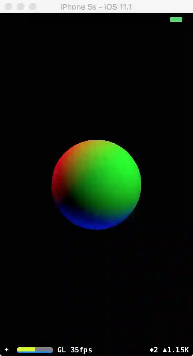 上面的代码,完整的实现了灯光,摄像和演员(3D物体)的准备。SCNScene是一个舞台,舞台的背景被我设置成了黑色UIColor.black。接着我们创建摄像机createCamera(),创建灯光createLight(),创建3D物体createGeometry()。最后这个舞台被赋给用于渲染3D场景的View scnView。后面的代码对scnView进行了配置。allowsCameraControl赋予了可以使用手势改变视角的功能。showsStatistics会显示一些指标参数,比如fps,顶点数等等。
