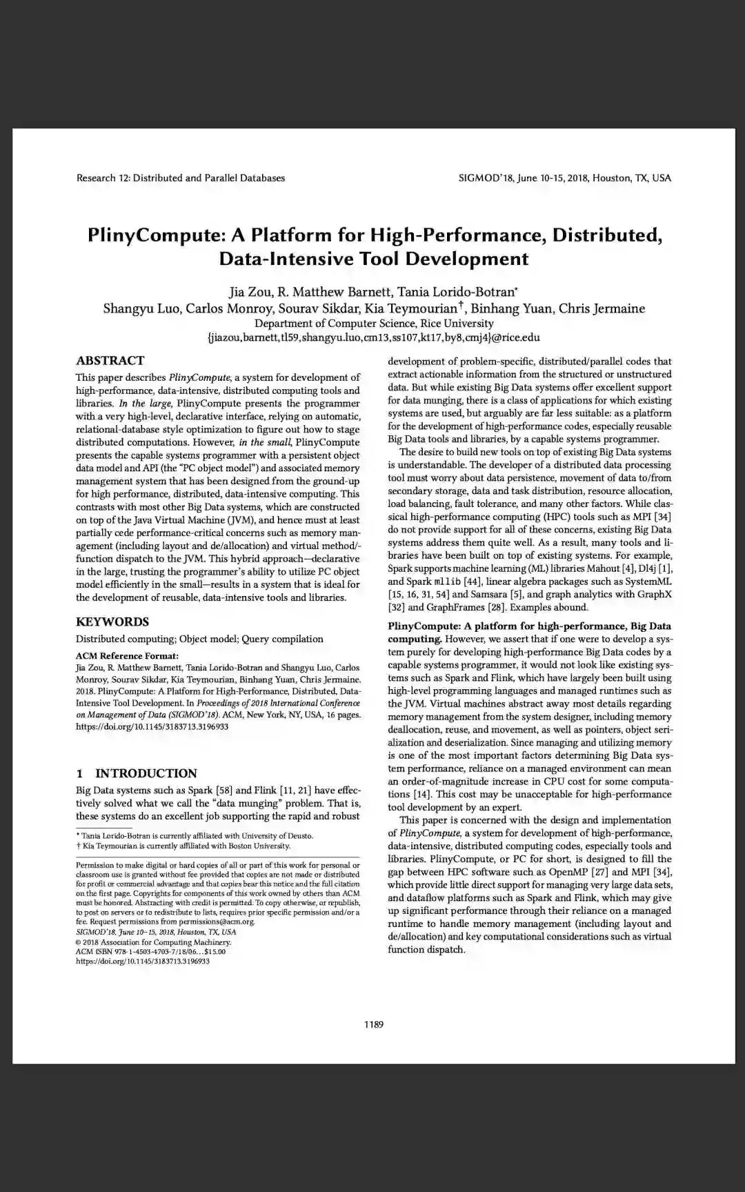 PlinyCompute SIGMOD论文的其他作者包括:Matthew Barnett、Tania Lorido-Botran、Shangyu Luo、Carlos Monroy、Sourav Sikdar、Kia Teymourian和Binhang Yuan,他们都来自赖斯大学。