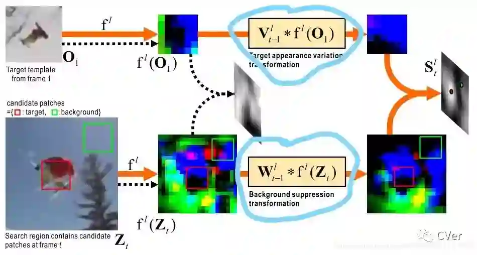 该算法在siamese-fc框架的基础上面添加了目标外观变换转换层和背景抑制变换层来提升网络的判别能力,即增强了模型在线更新的能力。