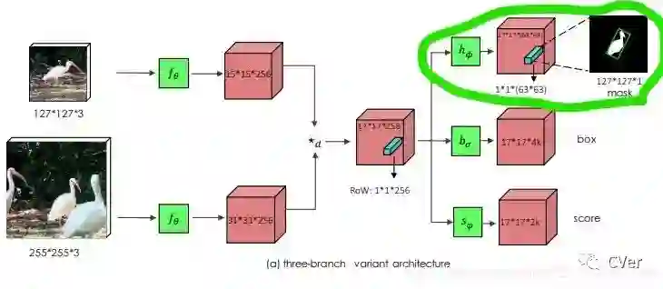 这篇文章的主要思路是在saimese-fc的基础上添加了mask分支,和mask-rcnn有异曲同工之妙,mask分支的存在使用检测的结果更加准确,同时该算法可以获取跟踪目标的BB和Mask,这在现实应用中有很多的用处!!!