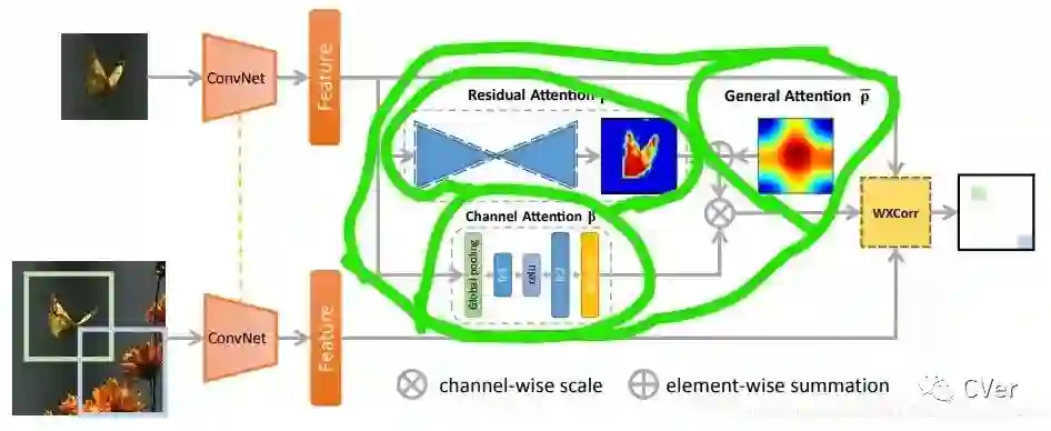 该算法中最大的特色是将Attention机制应用的淋漓尽致,使用到了3个注意力机制,包括残差注意力块,通道注意力块和通用注意力块。当时注意力机制比较火,刚好跟踪领域中应用的人比较少,通过注意力机制可以使得整个网络可以根据目标的变化而自适应的进行调整。不过遗憾的是作者论文说会开源代码却一直没有开源,然而该项目的github strat还高达68,让人很失望。