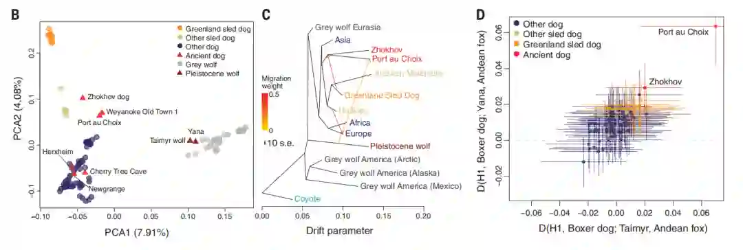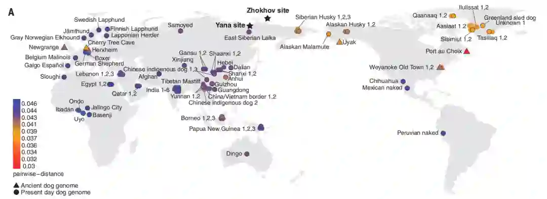 在此项研究中,研究人员从西伯利亚的佐霍夫岛(Zhokhov Island)上发掘到的一只9500年前的狗身上提取DNA,并生成基因组(“Zhokhov”, 9.6x coverage)。值得注意的是,这只来自9500年前Zhokhov犬被认为是最早的家养犬之一。