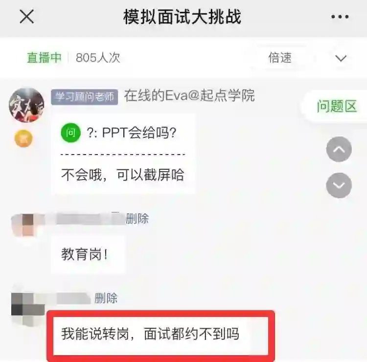 在直播课的最后,导师将在讨论区里进行免费答疑!有任何关于课程疑问或求职准备的难题,导师都会给你相应的建议。