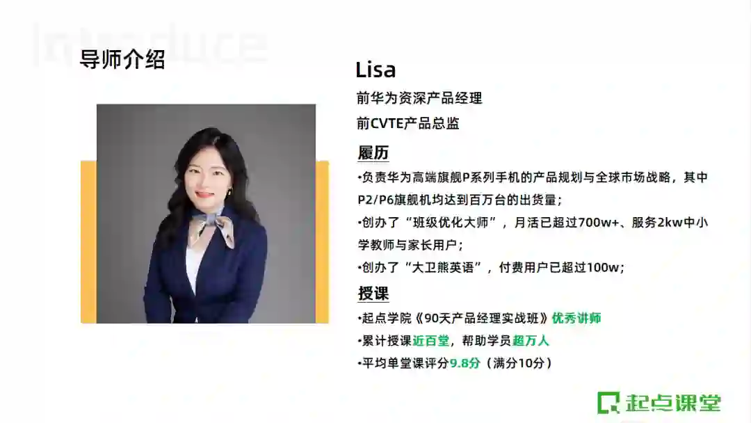 本次授课老师为前华为资深产品经理@Lisa老师,从事产品策划与管理工作有13年,具有丰富的产品团队管理与新人培养经验。