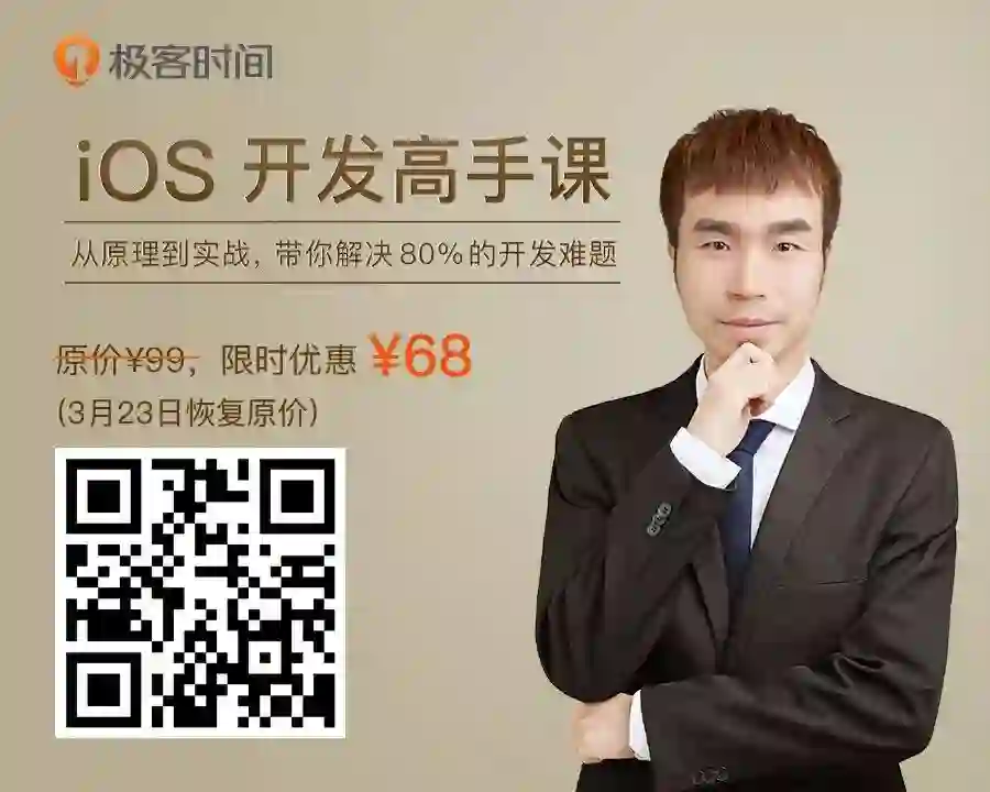 1、限时优惠 ¥68(原价 ¥99),2 杯咖啡的价格,获取戴铭老师十余年的技术沉淀,真正成为 iOS 开发高手。(另外,新注册用户将获得一张¥5 无门槛礼券,可与上新优惠同享哟~)