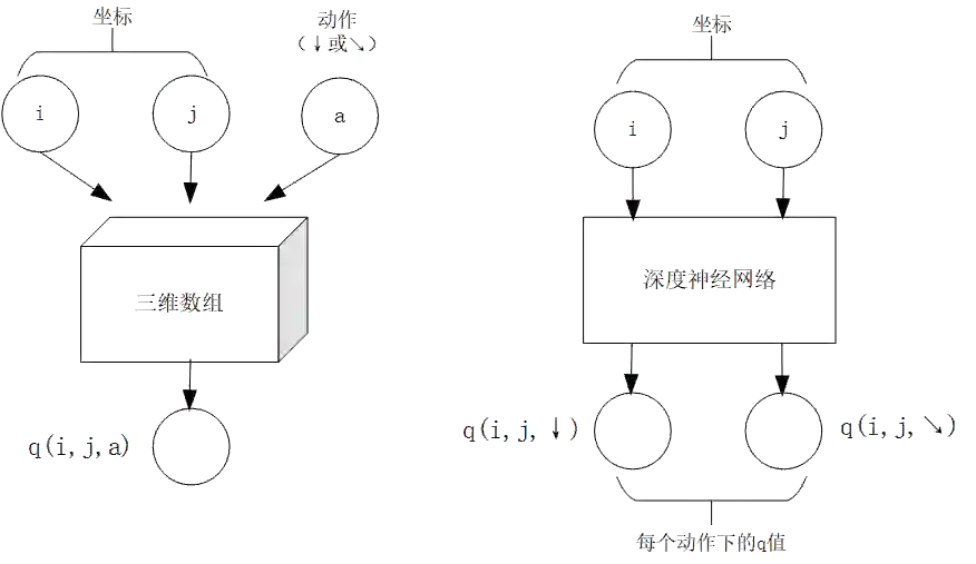对于数字三角形问题,左图为使用三维数组实现 ,右图为使用深度神经网络近似实现