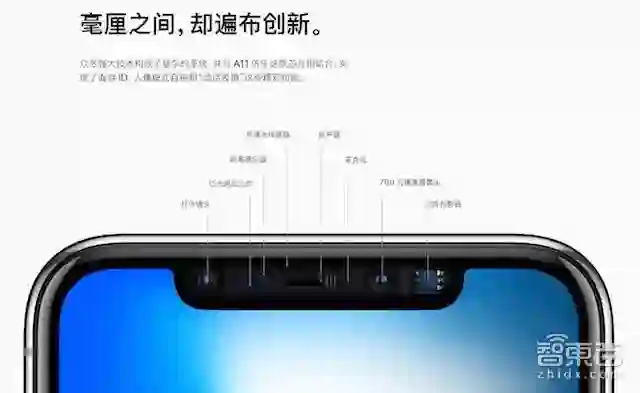 这一个区域集成了多达八个组件:麦克风、扬声器、前置摄像头、环境光传感器、距离感应器、红外镜头、泛光感应元件(Flood illuminator)、点阵投影器。苹果将整个系统称之为原深感摄像头(TrueDepth Camera System)。系统能够根据用户的脸部特征构建出一个“详细且深度的绘图,以便快速识别”。