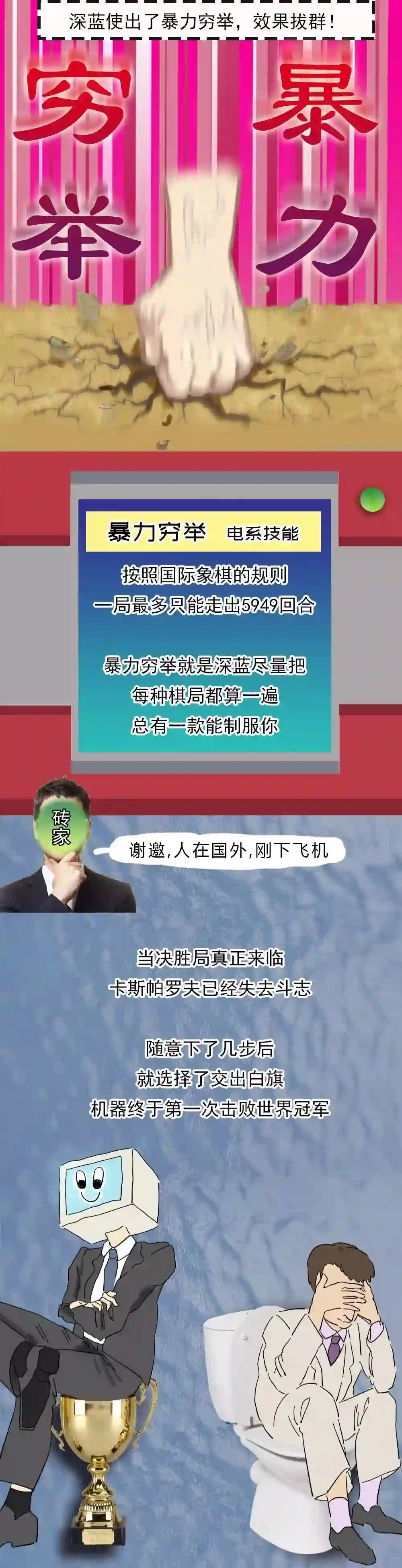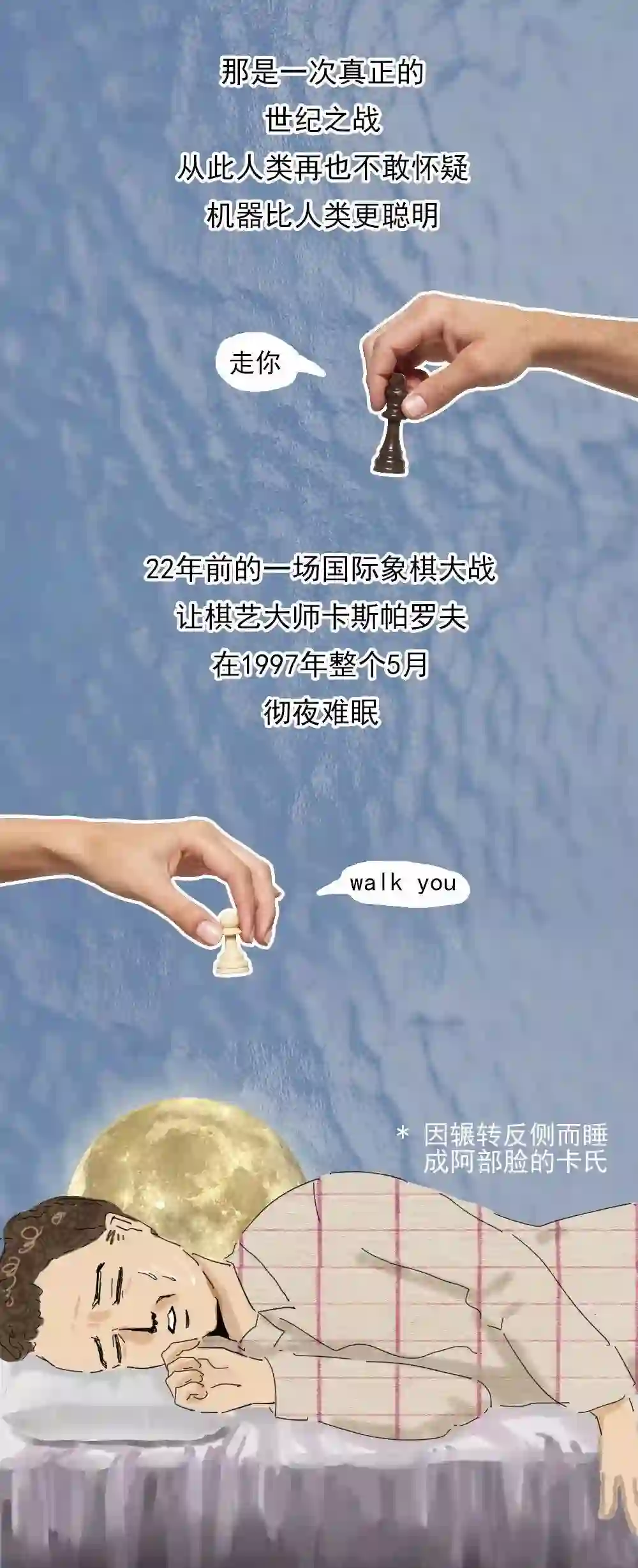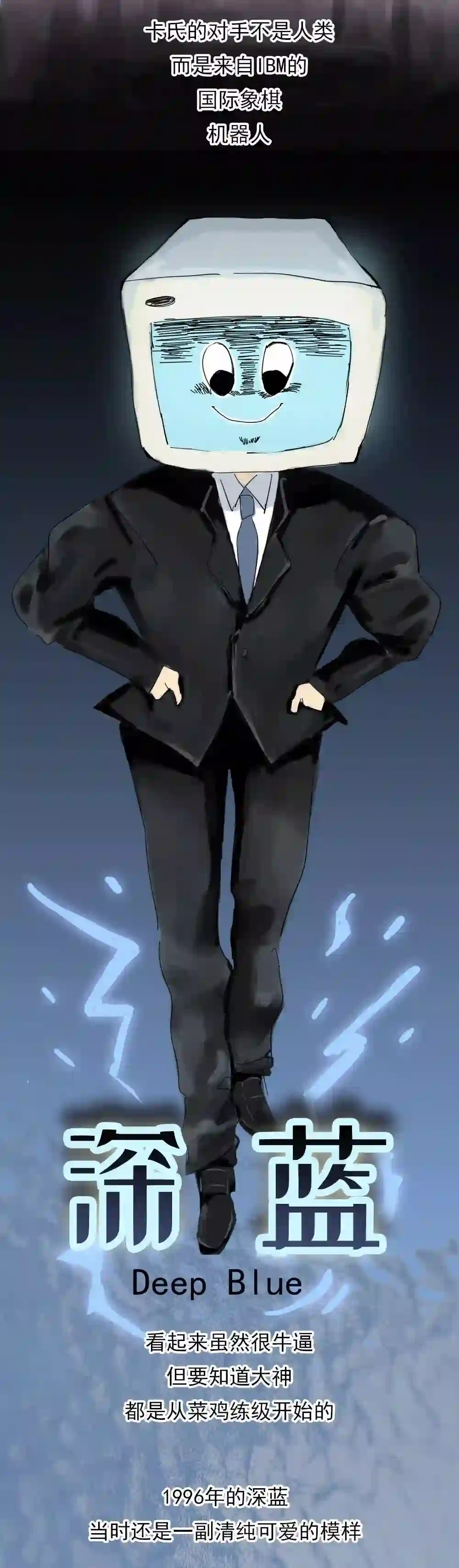 那是一次真正的世纪之战人类的一小跪机器的一大步从此人类再也不敢怀疑机器比人类更聪明22年前的这场国际象棋大战让棋艺大师卡斯帕罗夫彻夜难眠在1997年那个5月卡氏的对手不是人类而是来自IBM的国际象棋机器人深蓝!当时的卡斯帕罗夫11次获得国际象棋奥斯卡奖被认为是有史以来最强的棋手之一然鹅和深蓝对抗的决胜局他向“深蓝”交出膝盖的时候才走了19步深蓝是个体重1270公斤拥有32个大脑的大块头每秒可以计算2亿步棋脑子里装了近200年的棋局数据而它的必杀技是暴力穷举按照国际象棋的规则一局棋最多只能下5949回合而所谓暴力穷举就是深蓝尽量把每种棋局都算一遍总有一款能制服你深蓝手握着最佳答案在PK它当然不是一开始就这么厉害稚嫩版深蓝曾在1996年以2:4比分输给卡斯帕罗夫那时的卡氏留下一句话“这些计算机天生就蠢”深蓝肯定不服啊赶紧找了一屋子西洋棋大咖加班996给自己补充营养深蓝终于变成了比深蓝更蓝的Deeper Blue 深深蓝1997年5月深蓝和卡斯帕罗夫再次约架蓝别三日当刮目相待此时的深蓝已经如同一个杀手它不知疲倦也不会有心理起伏能干掉它的似乎只有拔电源六局pk中的前五局深蓝与卡斯帕罗夫打成平手决胜局赛前卡斯帕罗夫在房间里双手捂面嘴上说不怕,身体却很诚实当决胜局真正来临卡斯帕罗夫已经失去斗志随意下了几步后就选择了交出白旗机器终于第一次击败世界冠军卡斯帕罗夫自然也是不服的他怀疑深蓝第二局的几步棋有猫腻然而IBM拒绝出示系统日志很快深蓝被一拆为二一半放进博物馆一半封存到库房卡氏再也没了复仇的机会输给深蓝之前卡氏一度认为要到2010年机器才有机会战胜世界冠军但深蓝教会了卡氏怎么做人后来突飞猛进的AI 不断地证明它可以比人类更聪明但是我可以比你更善良啊