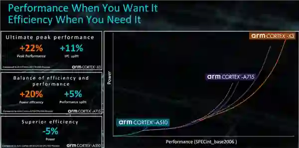 在这一代产品中,主要以性能的提升为目标。从 ARM 的官方数据可以看到,Cortex-X3 较上代提升了 22% 的性能表现;Cortex-A715 的性能比 Cortex-A710 提升了 5%,后者提升幅度不算高。