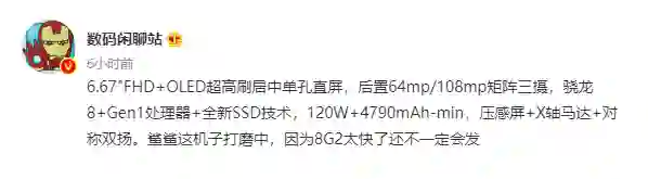 据 @数码闲聊站 今日爆料,新款的黑鲨游戏手机,将搭载骁龙 8+ 处理器,同时依旧保留自己 SSD 存储的技术特色。配置方面,该机正面预计会配备一块 6.67 英寸 FHD+ 的 OLED 单挖孔直屏,配备高刷新率,后置配备 6400 万像素或者 1 亿像素的主摄,内置 4790mAh 电池,支持 120W 快充。