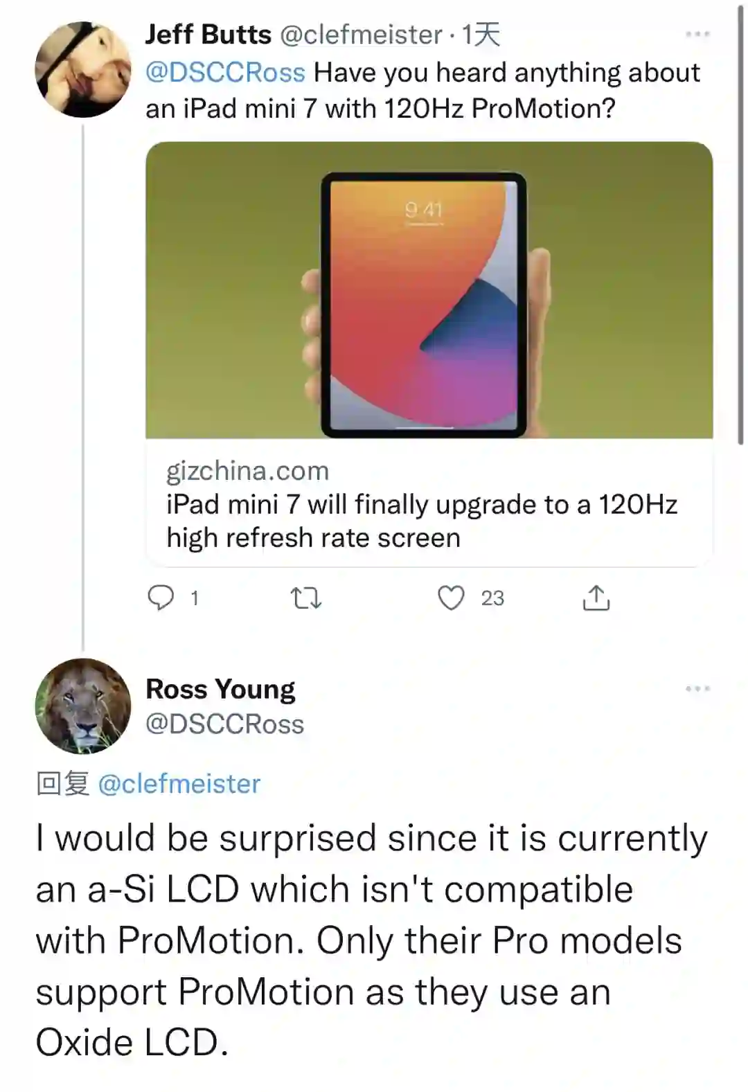 近期,有爆料称苹果将发布搭载 120Hz ProMotion 屏幕的 iPad mini 7,DSCC 分析师 Ross Young 对此传言表示质疑,因为苹果在 iPad mini 上使用的 LCD 面板并不兼容 ProMotion 技术。