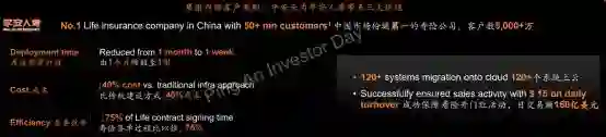 科技对内能够加强场景应用,助力业务降本增效,强化风险管理,打造客户极致体验,提升业务竞争力,比如平安云能帮助平安人寿降低40%成本,节约系统部署时间,提高效率;再比如AI技术运用于产险反欺诈和理赔等。