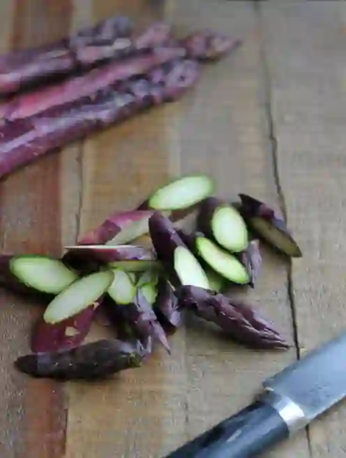 除了绿芦笋、白芦笋,市面上还能见到紫芦笋。这种芦笋起源于意大利,外观与绿色和白色的芦笋一样,只不过表皮含花青素呈现紫色,内心则为淡绿色。紫芦笋较其他品种更甜一些,所以十分适合做餐后水果生吃,口感清脆爽口。