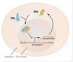 “周期基因”反馈调控简化说明。当“周期基因”活跃时,生成周期mRNA,将mRNA转运到细胞质中,并作为产生PER蛋白的模板。PER蛋白聚集在细胞核中,其基因活性被阻断。这引起了昼夜节律基础的抑制反馈机制。