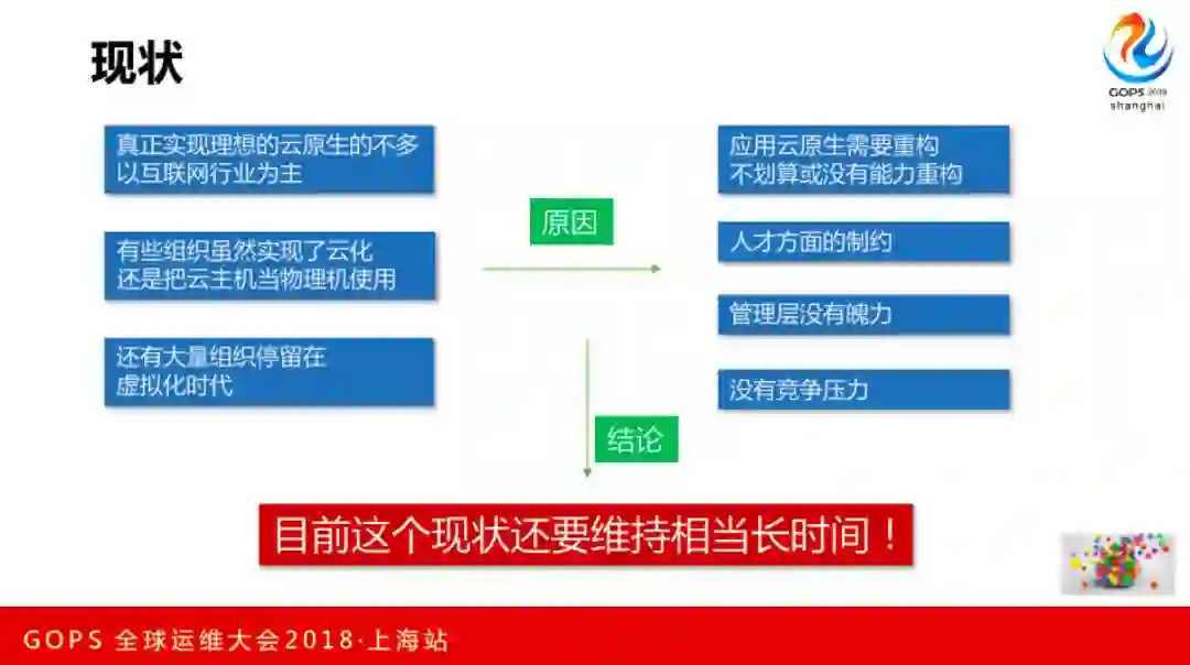 大部分组织或者有些组织只是实现了使用云主机或者虚拟机,离真正的云原生差距还是很大,还有很多的组织只能叫虚拟化,云可能都谈不上。原因是什么?第一个云原生要重构业务,觉得不划算,没这方面动力去做改变。