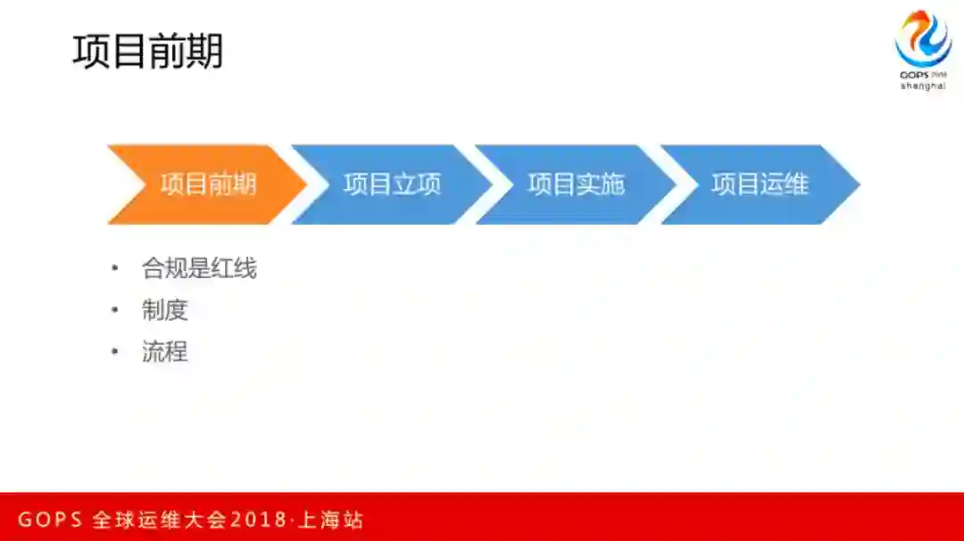我简单用一个项目的实施周期给大家介绍一下如何运行的。首先就是大型项目里合规是红线,必须要过三级等保,我们也有合规方面的专家。然后要有大量的基于ITIL的制度、流程等方面的储备。