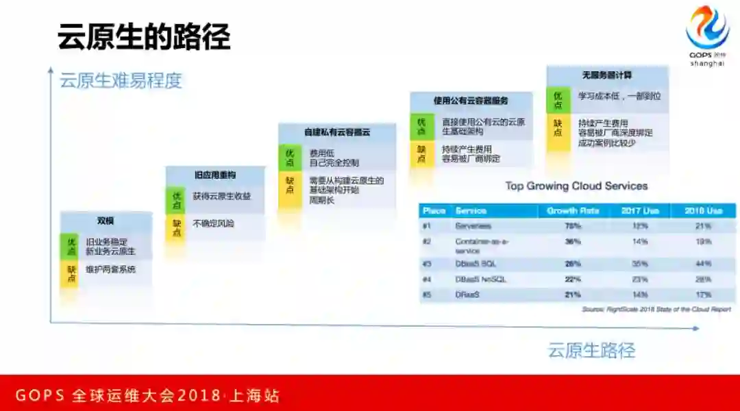 当然这是目标,怎么实现云原生呢?对于创业公司来说首选基于云的无服务器计算,一步可以实现云原生,好处是学习成本低,不好的地方就是要使用公有云,要持续产生成本,每个厂商的接口不一样,一旦基于某个厂商建设起来很容易被绑定。