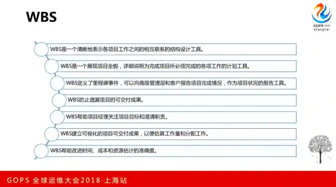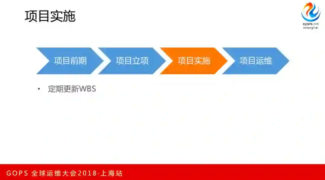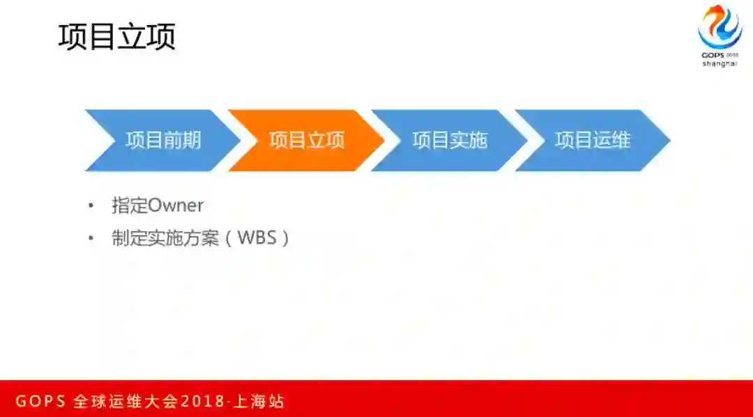 这就是我们人员组织方面的经验。然后就进入项目立项阶段,我们会指定Owner,然后制定实施方案,主要就是WBS的形式,WBS就是三个字母的缩写,Work、Breakdown、Structure,它是按照一定的结构模式去组织的。