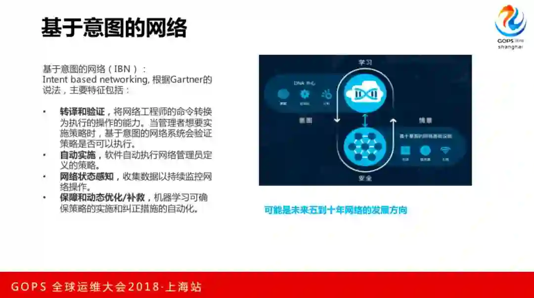 云方面还有一个技术 SDN,SDN实际就是把控制层面和转发层面分离。最近几年有一种声音,就是智能化的网络,我理解就是SDN+AI的解决方案,这个是思科网站的图,学习各种场景然后智能化。Ganter总结基于意图的网络有四个特征: