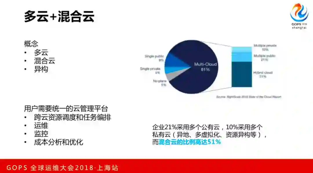 再就是多云和混合云,混合云也喊了好几年了,多云就是使用多个公有云,像国内的公有云、阿里云、腾讯云。混合云就同时使用多云和私有云,还有异构,既使用小型机,也使用X86物理机。
