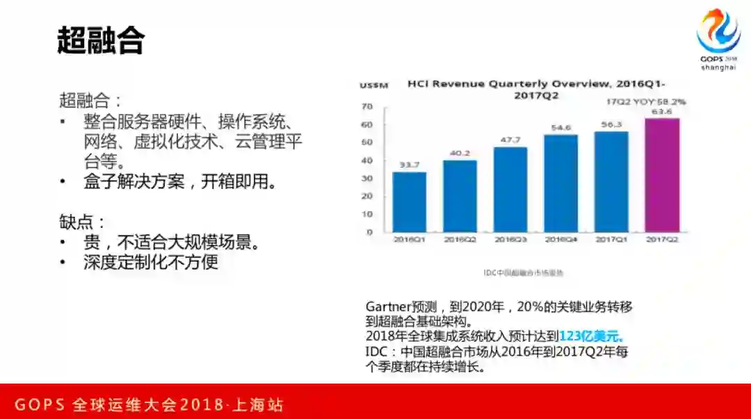这是中国超融合2016年的市场数据,每年有20%的增长。超融合好处是开箱即用,缺点是比较贵,不适合大型场景,中小企业比较适合,规模比较大的公司一方面成本比较高,一方面要定制化非常麻烦。