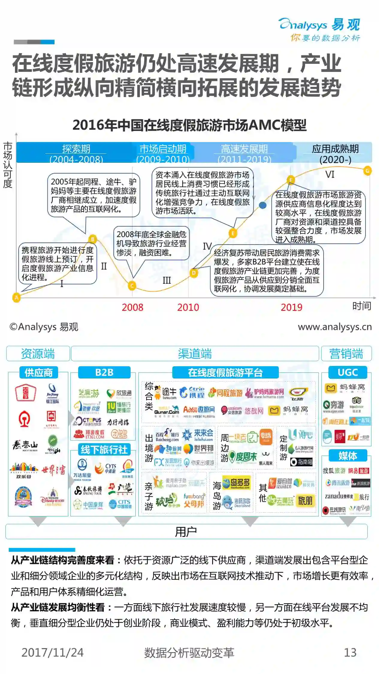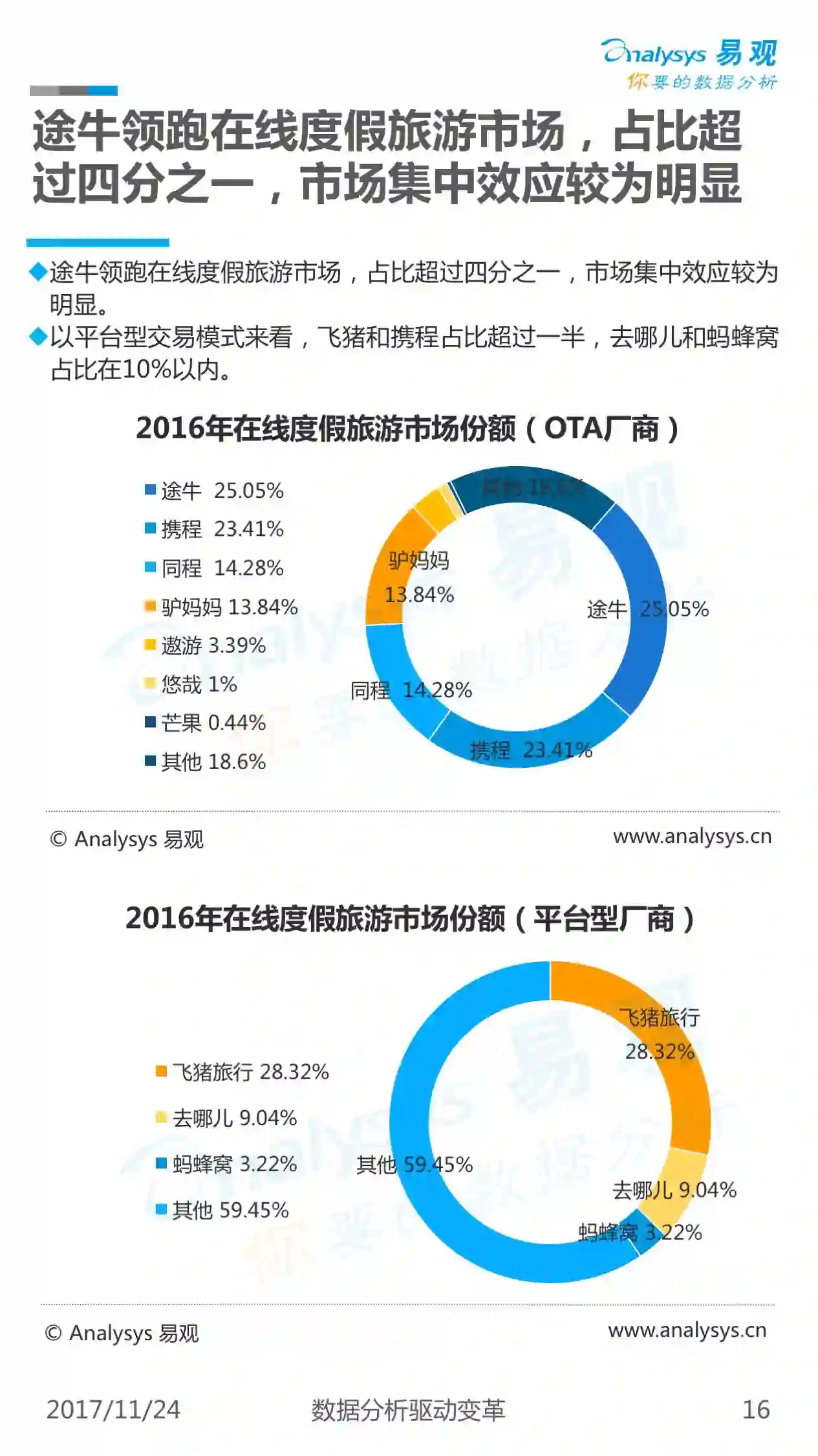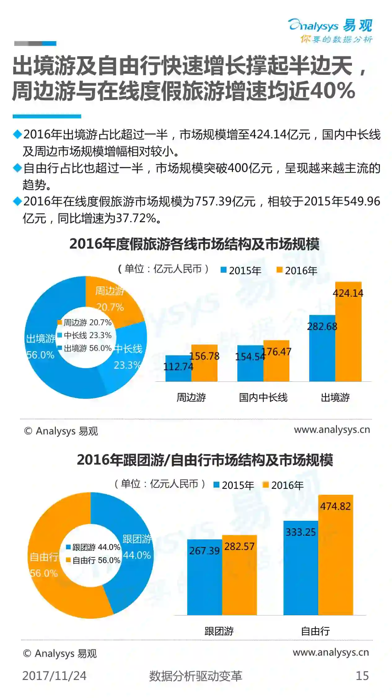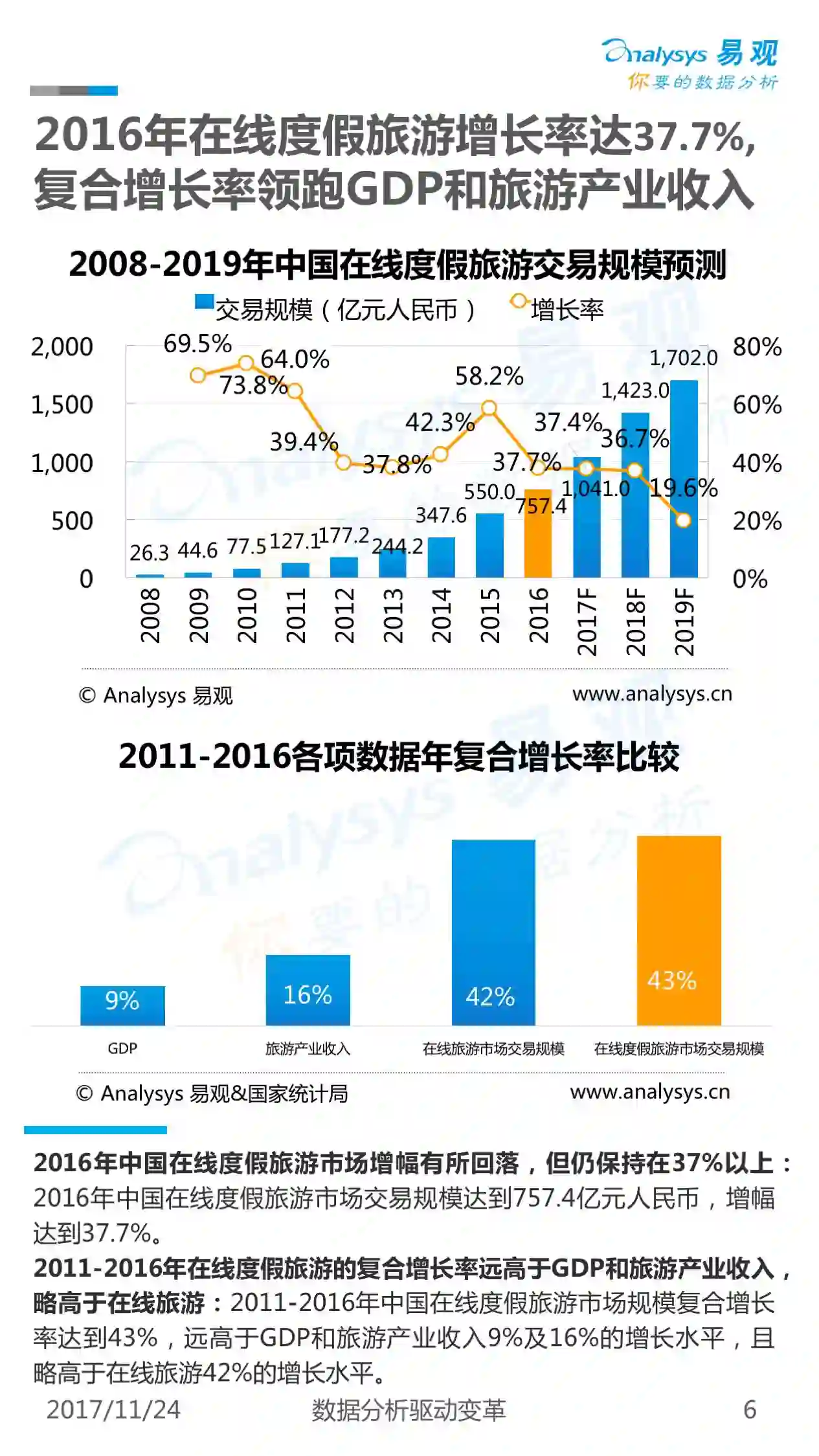 消费市场升级和互联网的深度渗透,助推在线度假旅游市场高速发展,2016年在线度假旅游市场交易规模为757.4亿元,同比增长为37.7%,领跑在线旅游及旅游产业增速。2016年在线度假旅游厂商对上下游资源进行集中深度整合,持续优化O2O竞争格局,并拓展出境、国内中长线及周边游三线的产品供给及盈利空间,在线度假旅游整体迈向服务升级、产品多元、深耕品质的时代。
