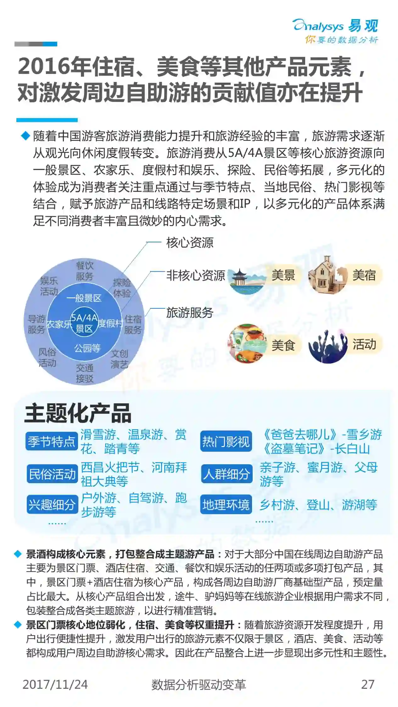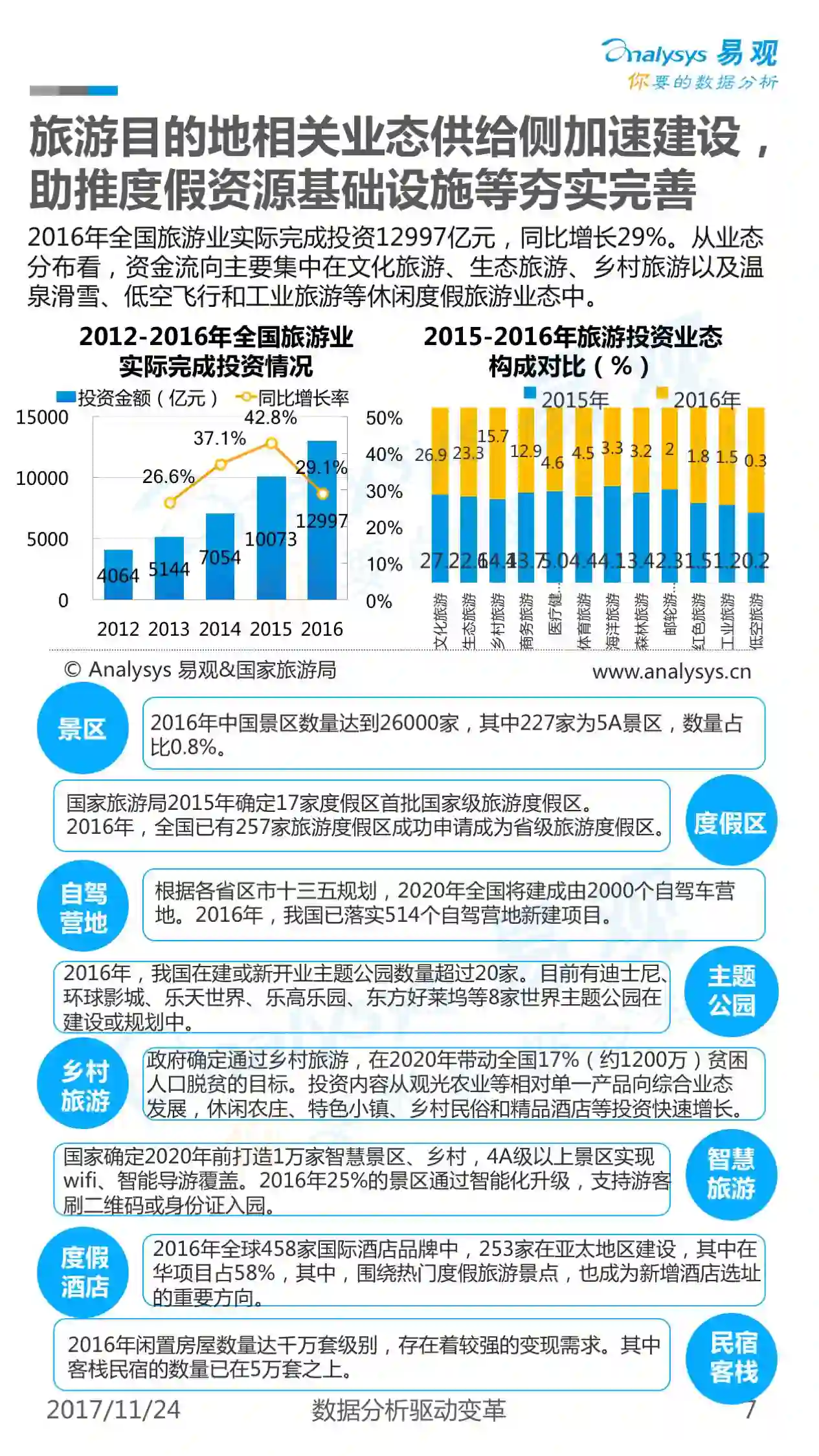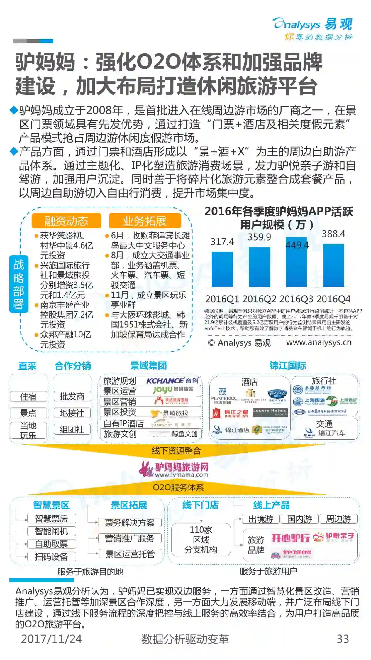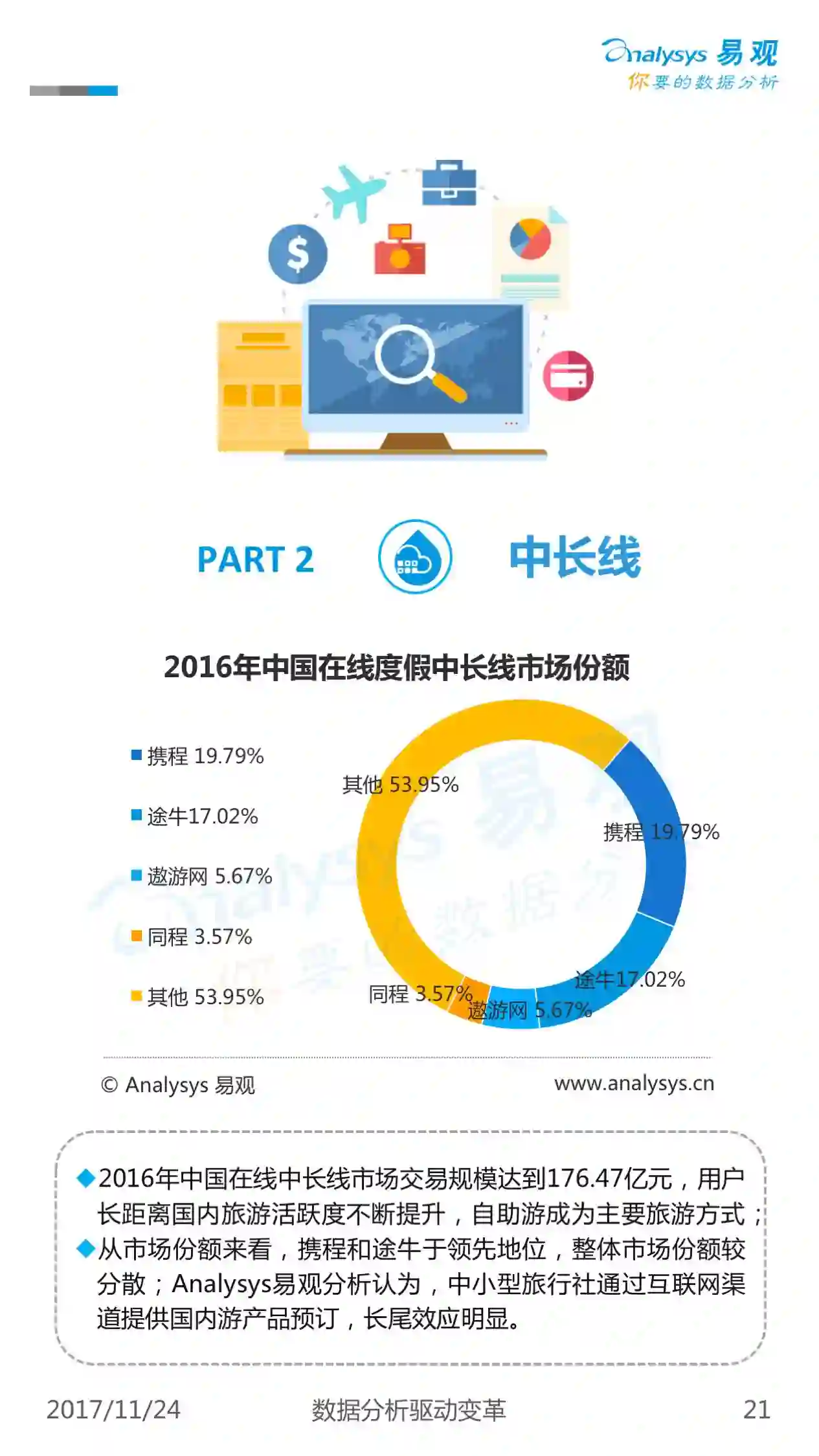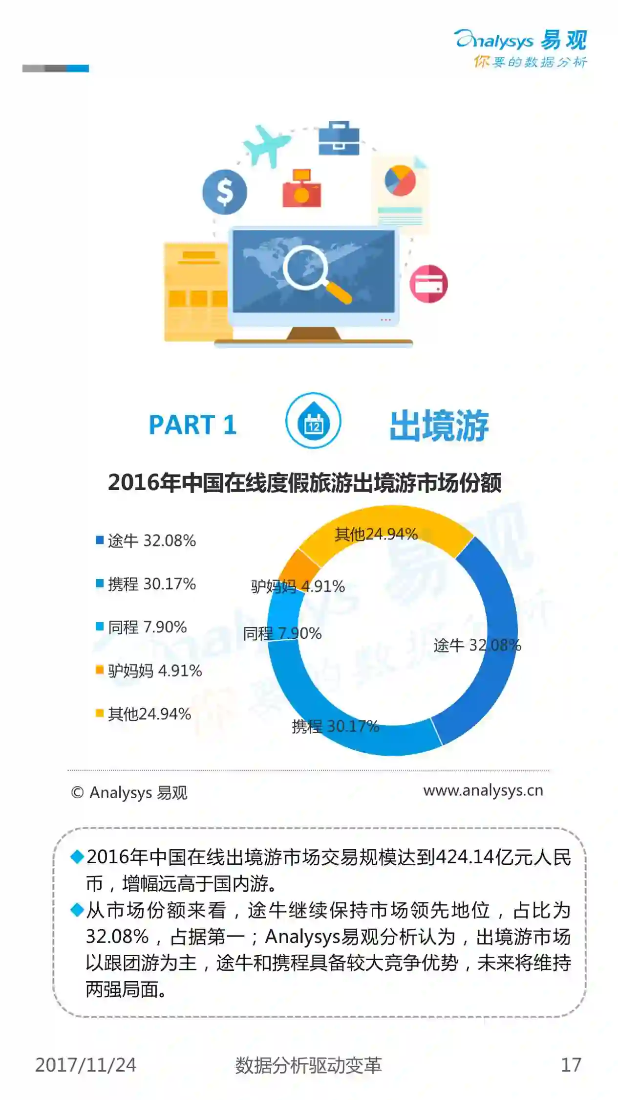 消费市场升级和互联网的深度渗透,助推在线度假旅游市场高速发展,2016年在线度假旅游市场交易规模为757.4亿元,同比增长为37.7%,领跑在线旅游及旅游产业增速。2016年在线度假旅游厂商对上下游资源进行集中深度整合,持续优化O2O竞争格局,并拓展出境、国内中长线及周边游三线的产品供给及盈利空间,在线度假旅游整体迈向服务升级、产品多元、深耕品质的时代。