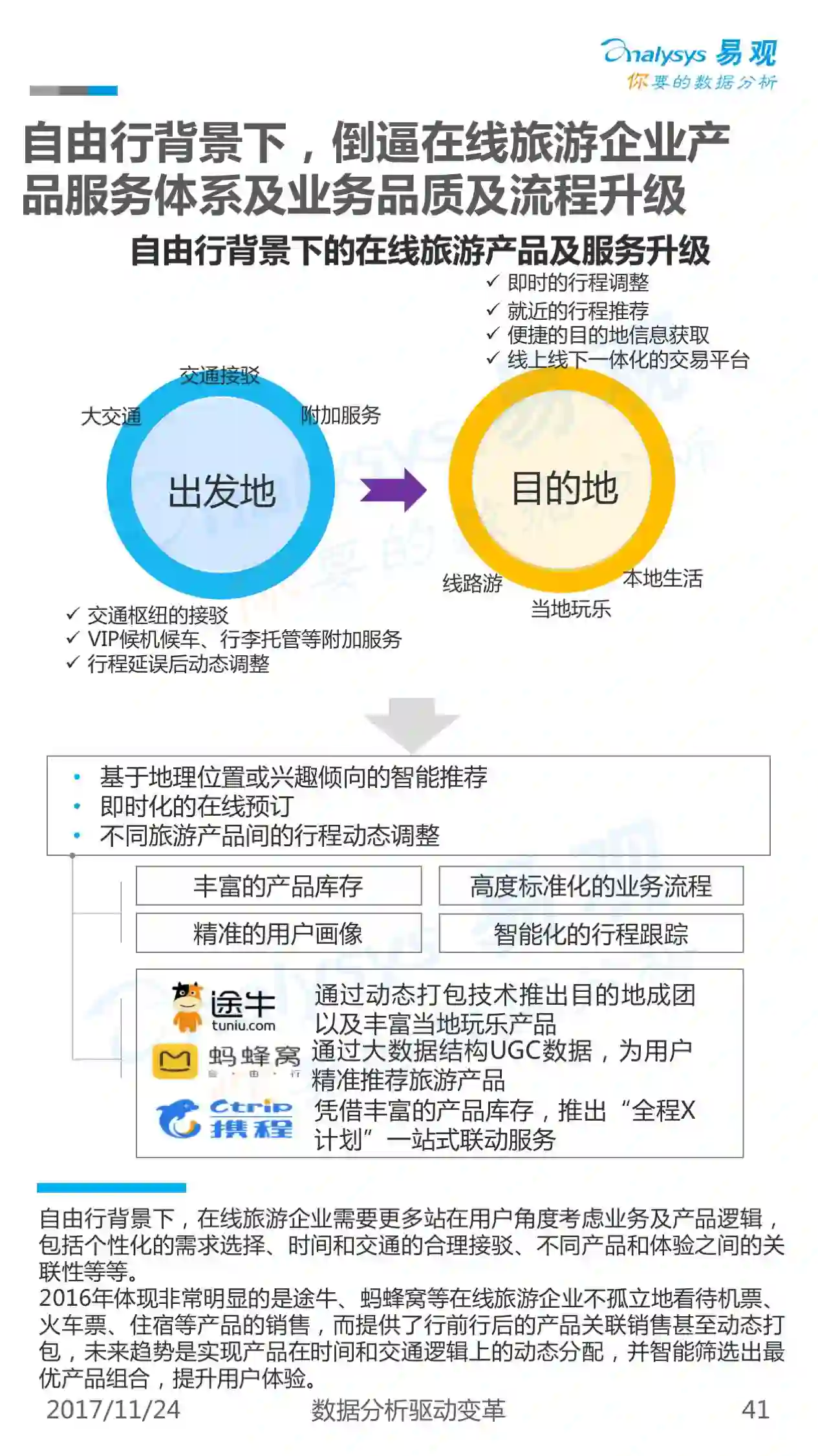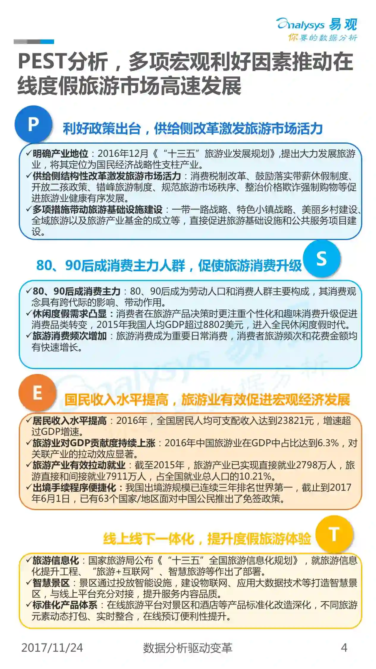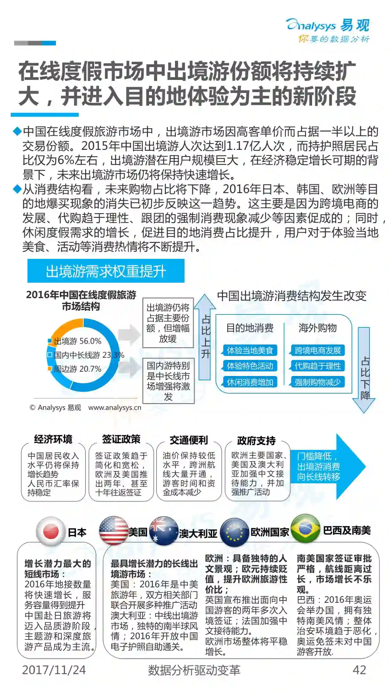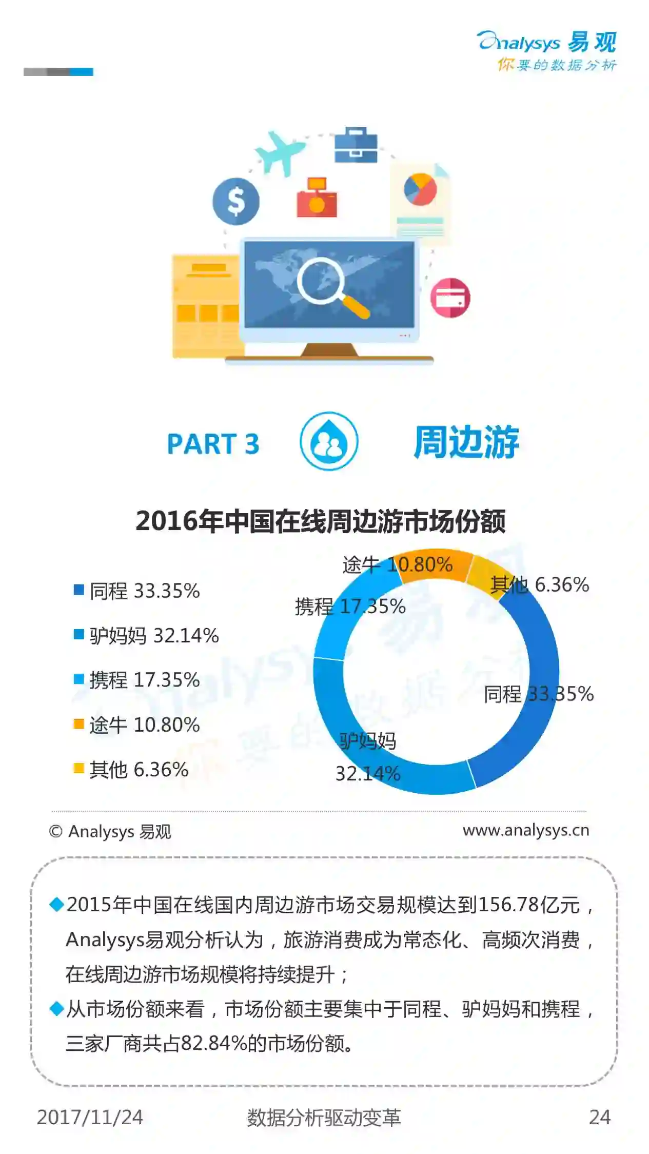 消费市场升级和互联网的深度渗透,助推在线度假旅游市场高速发展,2016年在线度假旅游市场交易规模为757.4亿元,同比增长为37.7%,领跑在线旅游及旅游产业增速。2016年在线度假旅游厂商对上下游资源进行集中深度整合,持续优化O2O竞争格局,并拓展出境、国内中长线及周边游三线的产品供给及盈利空间,在线度假旅游整体迈向服务升级、产品多元、深耕品质的时代。