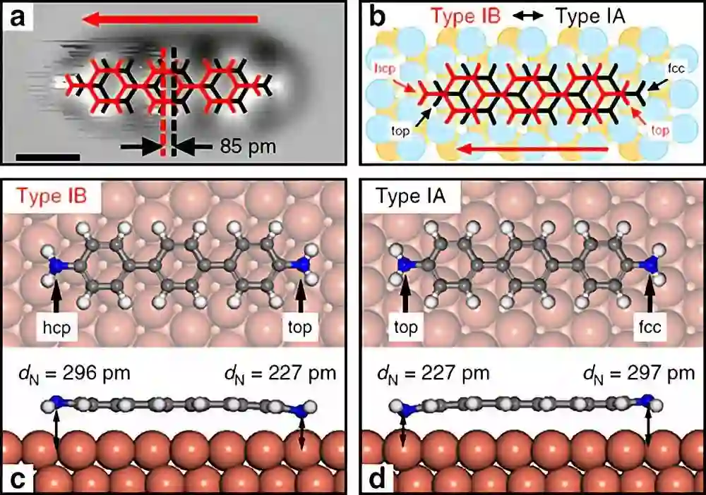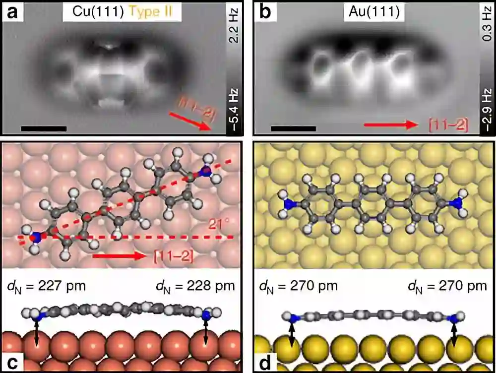 最近,杜世萱研究员(共同通讯作者)与苏州大学迟力峰教授和德国吉森大学André Schirmeisen教授合作,通过4,4″二氨基对三联苯(DATP)分子在Cu(111)表面上吸附导致的对称性破缺,实现了DATP中两个相同氨基的选择性活化。镜面对称的DATP分子在Cu(111)表面上吸附时,分子长轴沿着[11-2]及其等价晶向方向,在AFM图像中分子一端呈现模糊的特征,分子的镜面对称被打破(图1)。化学键分辨的AFM表征结合第一性原理计算揭示了DATP分子与Cu(111)的晶格失配使得分子内两个等价的氨基官能团吸附在铜表面的不同位置,一端吸附在铜原子的顶位,另一端吸附在表层Cu原子的空心位(图3)。其中吸附在顶位的氨基相比另一端的氨基与铜表面的距离更近,与表面的相互作用更强,因此活化程度更强,使其在针尖的影响下呈现非稳态特征,并且优先与2-三亚苯甲醛(TPCA)分子以氢键结合(图5)。当将DATP分子吸附在Au(111)表面上时,由于分子长度与基底晶格匹配,分子仍然保持镜面对称,两端的氨基吸附位置相同,因此两端氨基的活化程度相同(图4)。DATP分子与Cu(111)表面的晶格失配引起的分子不对称吸附和特定官能团的活性增强,为对称分子中等价基团的选择性功能化提供了一种广泛使用的途径,为表面上的不对称化学反应提供了一条新的思路。