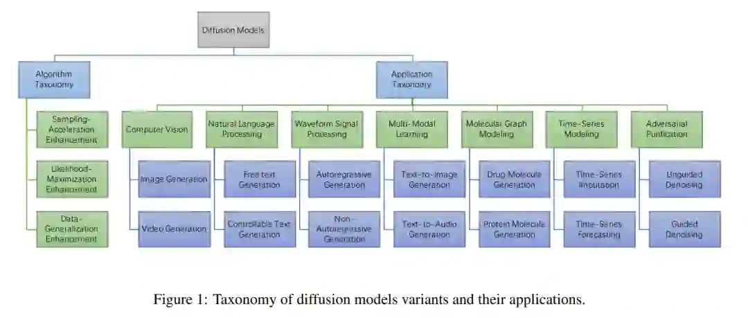 新分类法。我们首先提出了一个新的和系统的分类扩散模型及其应用。具体而言,我们将现有的扩散模型分为三大类: 采样加速增强、似然最大化增强和数据泛化增强。此外,我们将扩散模型的应用分为七大类: 计算机视觉、自然语言处理、波形信号处理、多模态学习、分子图生成、时间序列建模和对抗性净化。