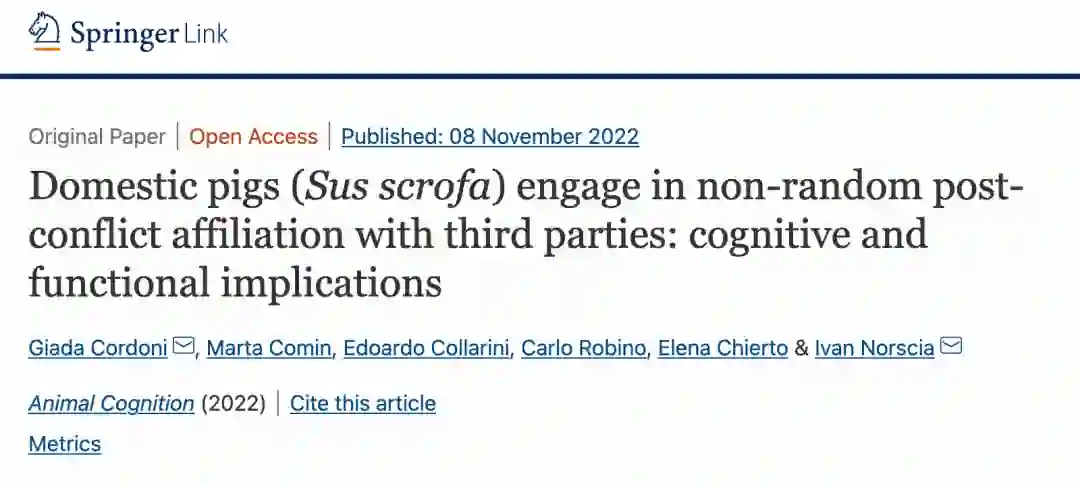 相关研究论文以“Domestic pigs (Sus scrofa) engage in non‐random post‐conflict affiliation with third parties: cognitive and functional implications”为题,已发表在科学期刊 Animal Cognition 上。