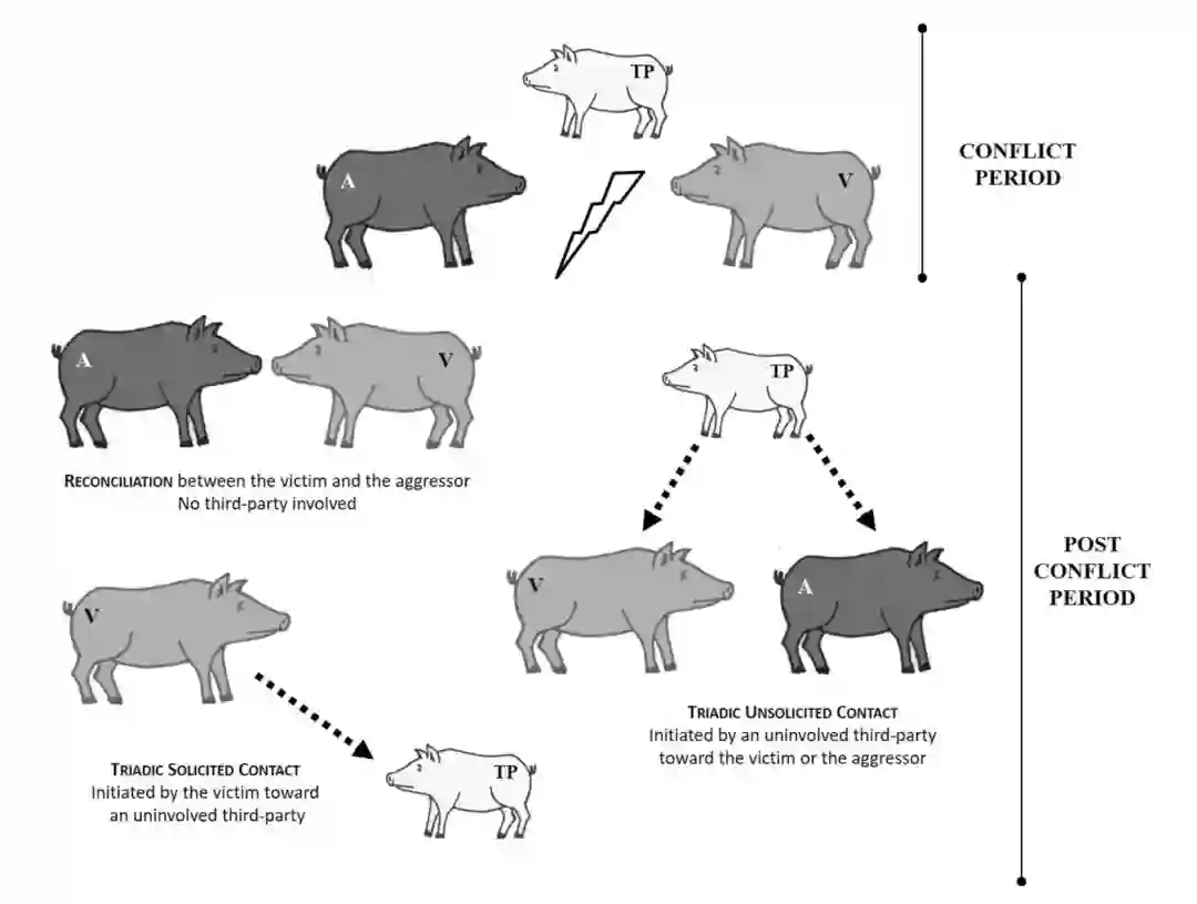 远亲或者没有关系的家猪,在冲突后更有可能做出和解行为,以确保它们在群体中仍能获得社会支持和食物