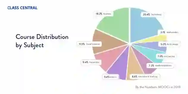 总体而言,跨学科的课程分布与去年非常相似。 百分之四十的课程属于最容易货币化的类别:商业和技术。