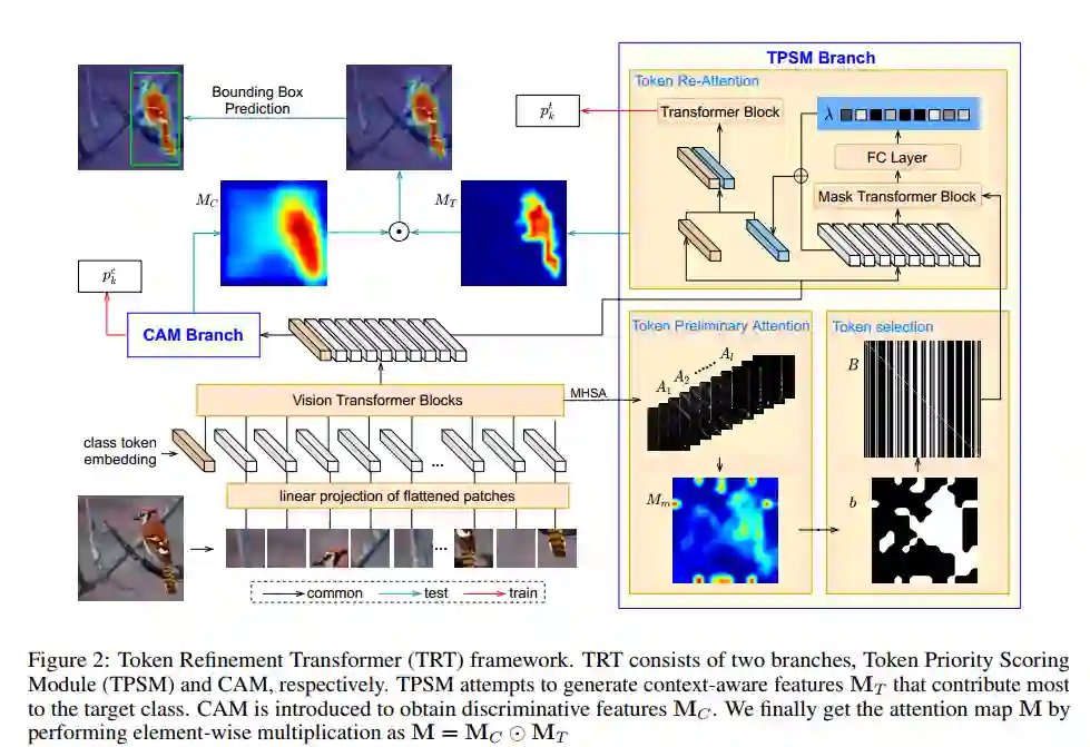 上图 2 展示了 TRT 方法的整体框架图,TRT 由 TPSM(Token Priority Scoring Module)和 CAM ( Class Activation Map ) 两个分支构成。其中 TPSM 分支主要由 Token Preliminary Attention、Token Selection 和 Token Re-Attention 三部分组成。Token Preliminary Attention 表示利用 transformer 网络不同层的 class token 和 patch token 之间的长程依赖关系构建初步注意力图;Token Selection 指构建自适应阈值策略,筛选出初步注意力图中与 class token 关联性更高的 patch token;Token Re-Attention 指对筛选的 patch token 执行再注意操作。
