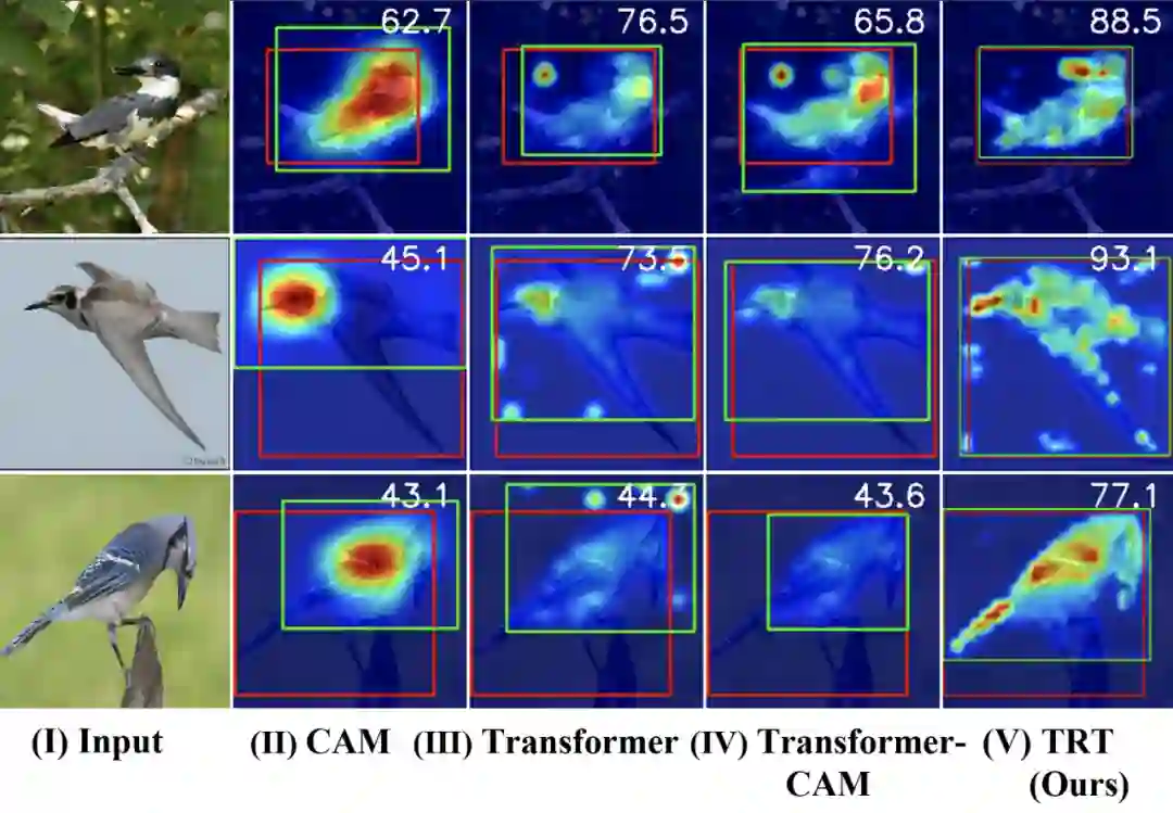 下图 1 展示了不同方法的可视化定位结果,可以看出 CAM 方法存在明显局部聚焦的问题;Transformer 的长程依赖容易产生背景误定位的现象;融合 Transformer 长程依赖和 CAM(参照 TS-CAM 论文方法)的方法虽然一定程度上缓解了局部聚焦和背景干扰的问题,但是问题依旧存在。