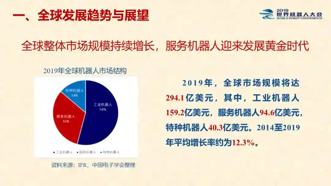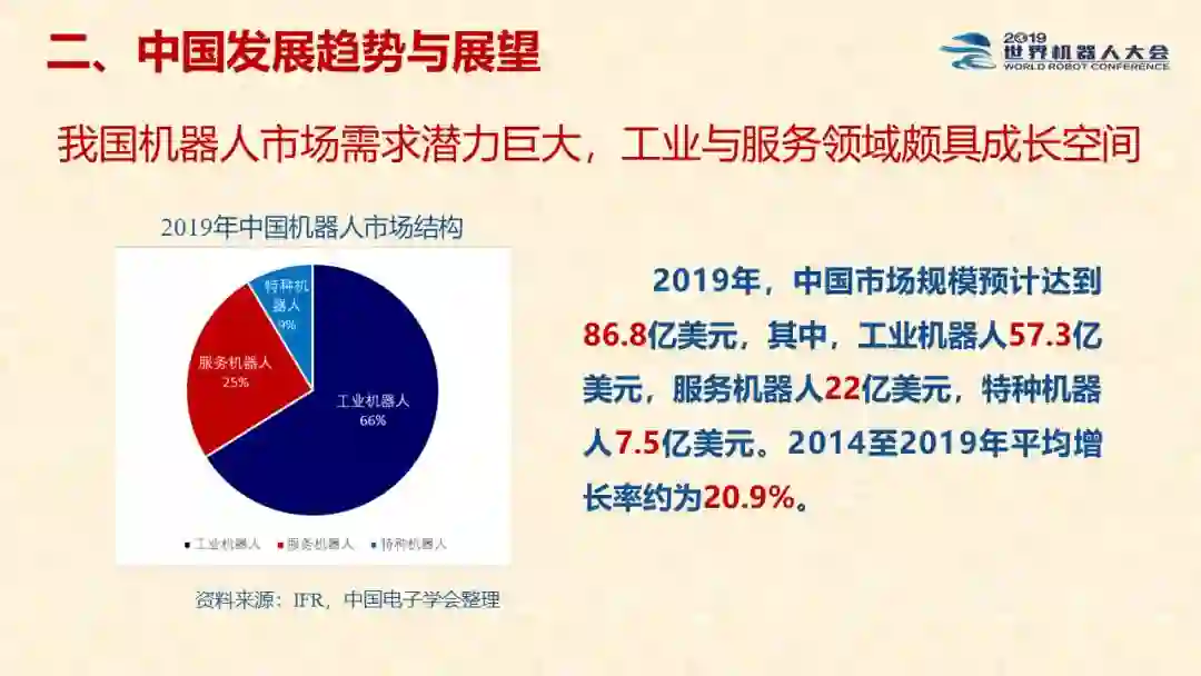 近日,在2019世界机器人大会闭幕式上正式发布《中国机器人产业发展报告(2019)》。该报告由中国电子学会组织相关专家及研究人员共同编制,是工信部2019-2021年财政专项《我国机器人产业发展水平评估体系构建与智能机器人产业链增长点研究》的阶段性研究成果。以下为发布PPT以及报告主要内容,供大家学习交流。本文来自:CIE智库,报告版权归原机构所有,由《走向智能论坛》公号推荐阅读。