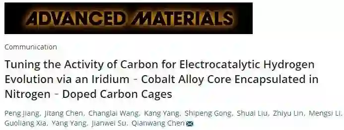 近日,中国科学院强磁场科学中心双聘研究员,中国科学技术大学合肥微尺度物质科学国家研究中心、化学与材料科学学院教授陈乾旺课题组以贵金属铱掺杂的金属有机框架材料作为前驱体,一步煅烧制备了氮掺杂的类石墨烯层包裹铱钴合金核壳结构材料,在酸性电解质析氢反应中表现出高活性和高稳定性。相关研究成果发表在《先进材料》上,博士研究生江鹏、陈继堂、王长来为论文共同第一作者。