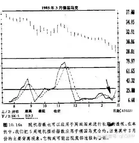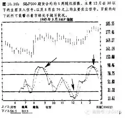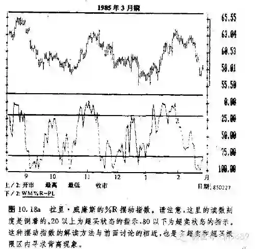 拉里·威廉斯指数与随机指数的概念类似,也表示当日的收市价格在过去一定天数里的全部价格范围中的相对位置。把这段日子里的最高价减去当日收市价,然后把所得的差除以这段日子的全部价格范围,就得到当日的威廉斯指数。不过,威廉斯指数的刻度与随机指数的刻度比起来,顺序正好相反,0到20算作超买区,80到100为超卖区。前面关于各种摆动指数的讨论也适用干%R,其中的要点也在于发生在超买或超卖区的相互背离现象(见图10.18a和b)。