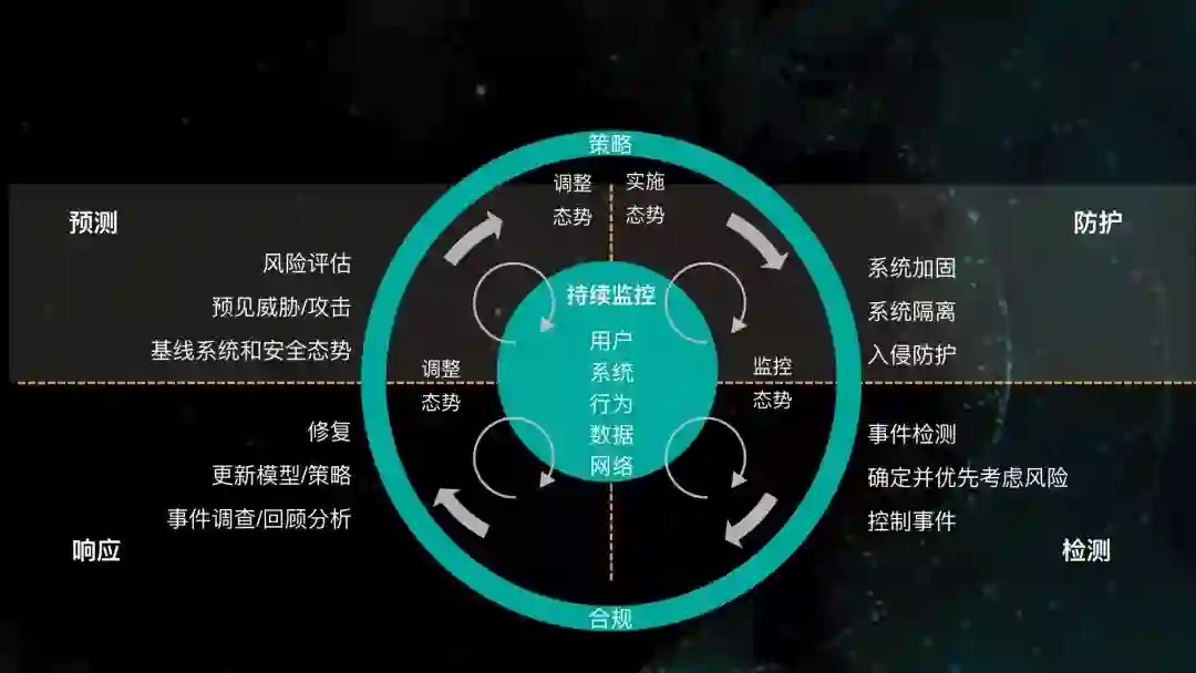 自适应架构高大上的地方就不谈了,预测、防护、检测、响应。其实在做好各方面防护的基础上,客户最需要的是检测及响应能力,单方面的检测和响应很普遍,WAF有报警,主机IDS有报警,PC终端有报警,APT有报警,但是关联起来的能力……