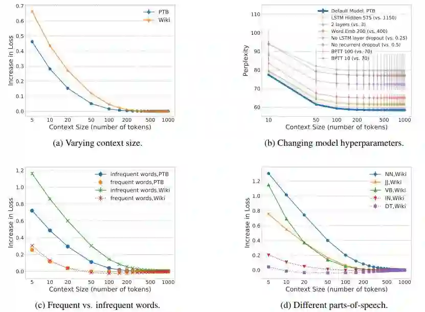 图 1:改变上下文中包含的单词数的影响,与在相同的模型上使用无限制的上下文进行对比。损失的增长表示由于上下文限制,损失在整个语料库上的负对数似然的绝对增长。所有的曲线都是由三个随机种子生成的实验结果的平均,误差条表示标准差。(a)模型在 PTB 数据集上的有效上下文的大小为 150 个单词,在 Wiki 数据集上的有效上下文的大小为 250 个单词。(b)改变模型的超参数不会改变模型对上下文使用的趋势,但是确实会影响模型性能。本文展示了这种误差,强调这种一致的使用趋势。(c)非频繁出现的单词需要比频繁出现的单词更多的上下文。(d)实词比功能词需要更多的上下文。