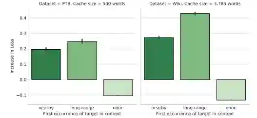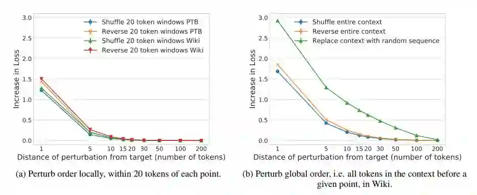 通过实验,本研究发现: LSTM 平均能够利用大约 200 个单词的上下文,并且在更改超参数的设置时没有显著的改变。在这个上下文的范围内,词序仅仅与 20 个最邻近的单词或者大约一个句子长度的单词相关。在长距离上下文中,词序对性能几乎没有影响,这表明模型保存了远距离单词的高层次的、有模糊语义的表征。最后,本研究发现 LSTM 能够重新生成邻近的上下文中的一些单词,但是这高度依赖于缓存帮助它们从长距离上下文中复制单词。