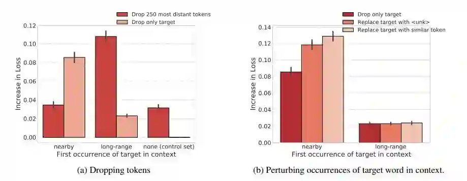 图 4:在 PTB 数据集上,对上下文中的目标词进行扰动的影响与完全删除长距离上下文的影响的对比。误差条表示 95% 的置信区间。(a)只能从长距离上下文中复制的单词对于删除所有长距离单词比对于删除目标单词更加敏感。对那些可以从邻近的上下文中复制的单词来说,只删除目标单词对于损失的影响比删除所有的长距离上下文的影响大得多。(b)对于可以从邻近的上下文中复制的单词来说,使用词汇表中的其它单词替换目标单词,比将其从上下文中删除更损害模型性能。而这对于只能从远距离上下文中复制的单词没有影响。
