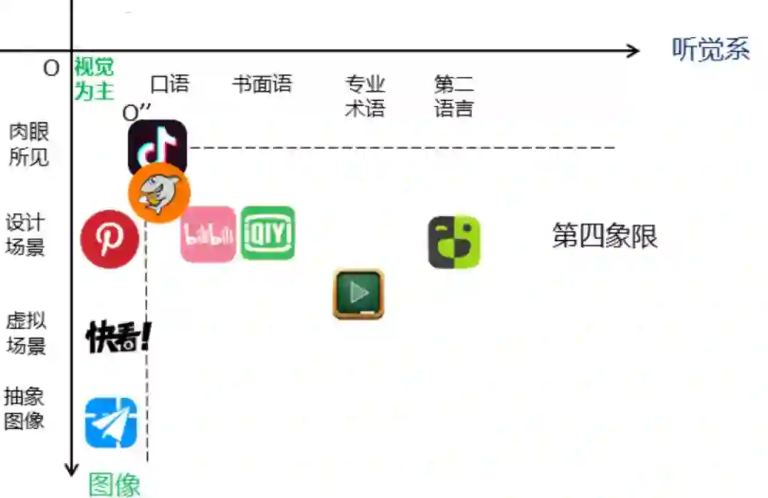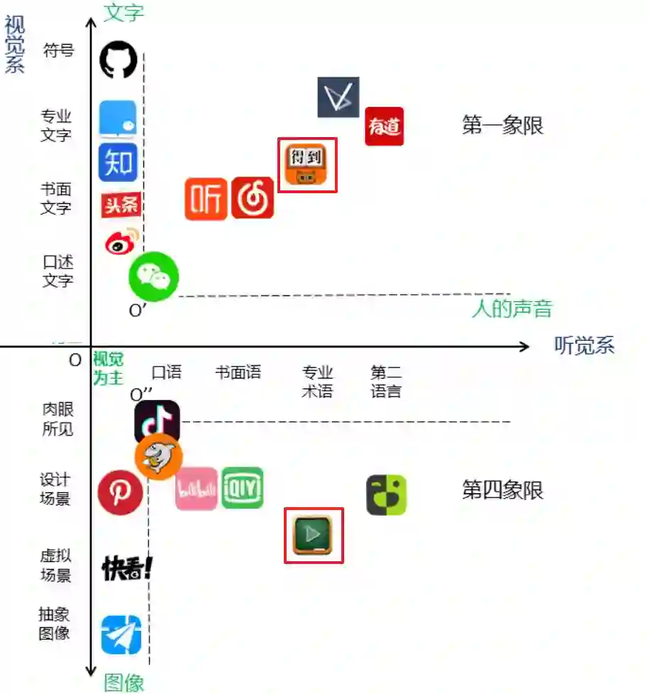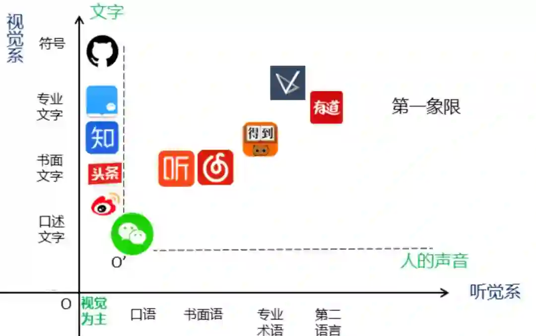 那么,我们以听觉系为X轴、视觉系为Y轴,建立二维直角坐标系。听觉系的两端为人的声音(以语言为主)、自然声音;视觉系的两端则是文字和图像。