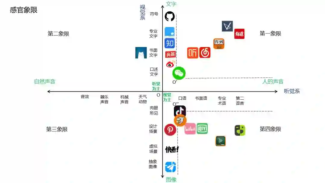 按这样的形式,我们可以把互联网中主要功能为信息传递的产品(以某个特定的产品来代表其类型的产品),填入感官象限中(为了区分产品需要的是单一感官和两种感官,我用 O'和 O"将需要两种感官的象限重新作了划分)。