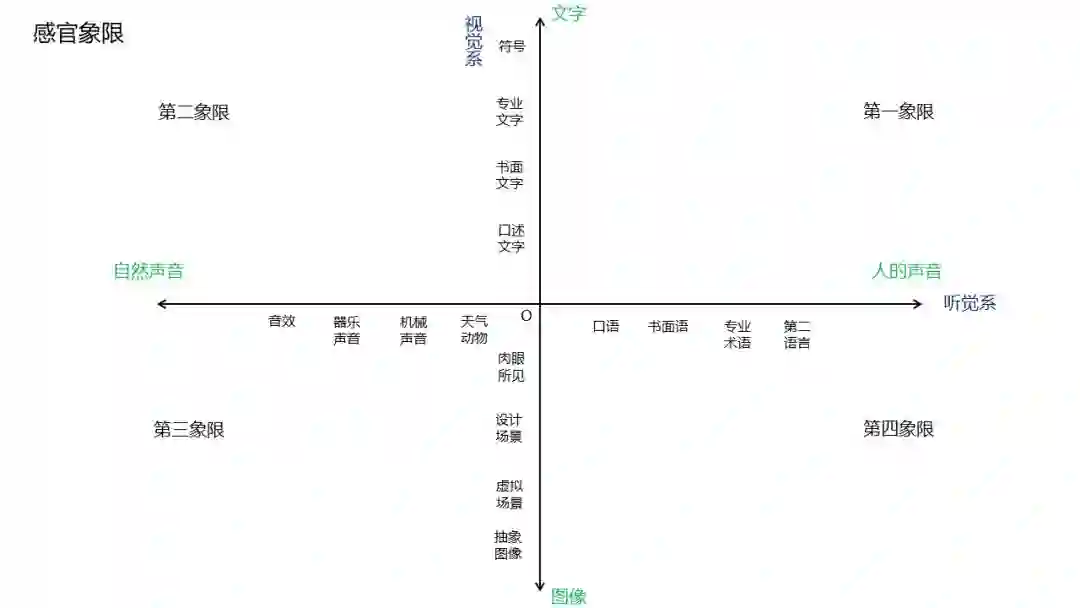 比如,听觉系在第一象限的划分方式就是口语、书面语、专业术语、第二语言,同理也对其他象限的坐标轴进行划分。